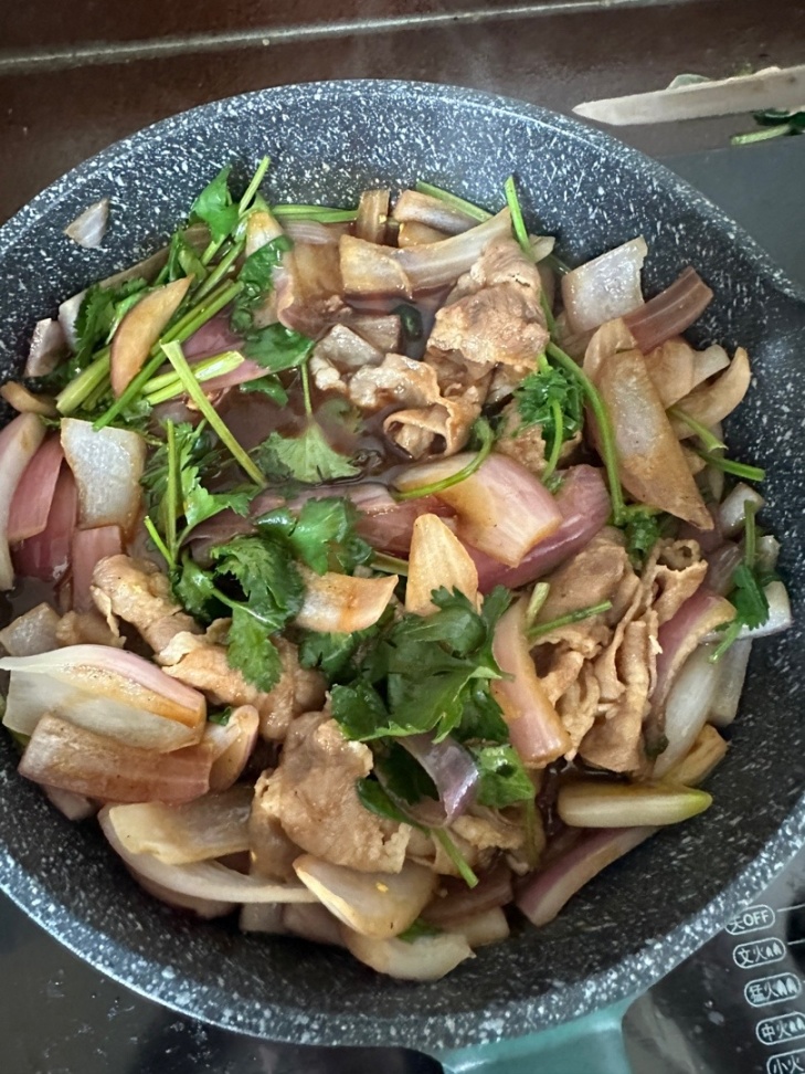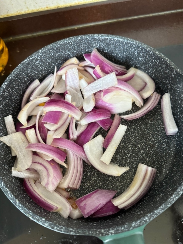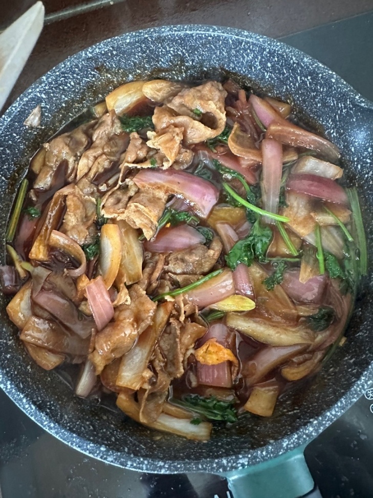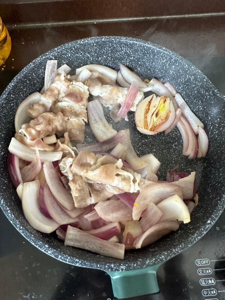 3.起鍋燒油加入洋蔥翻炒變軟加入肥牛繼續翻炒