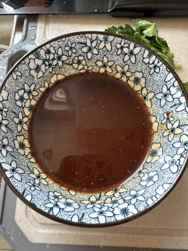 4.調製醬汁:老抽1勺+生抽1勺+蠔油1勺+料酒1勺+蜂蜜或白糖半勺+黑胡椒小半勺+澱粉半勺,放入少許清水化開醬汁是照燒風味的