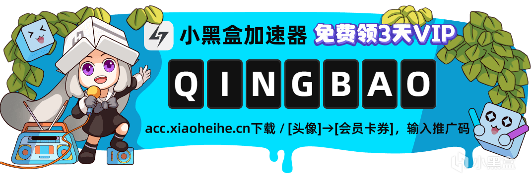 前往PC端小黑盒加速器客戶端,點擊左上角充值—會員卡券,輸入福利碼“QINGBAO”,即可免費領取3天會員時長噢~ 3天時長包括PC端加速器和手遊端噢~趕快行動起來吧!