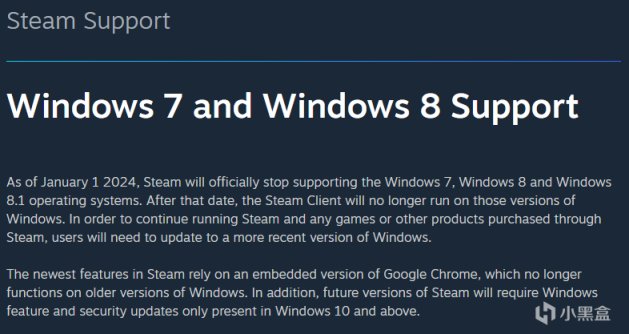 Steam方面,Steam平台作为老牌游戏平台,在2003年首次发布,可以便捷的管理和更新游戏,深受用户喜爱,而就在今天,Steam宣布从2024年1月1日起不再支持Windows7和8,这将影响超过30万用户