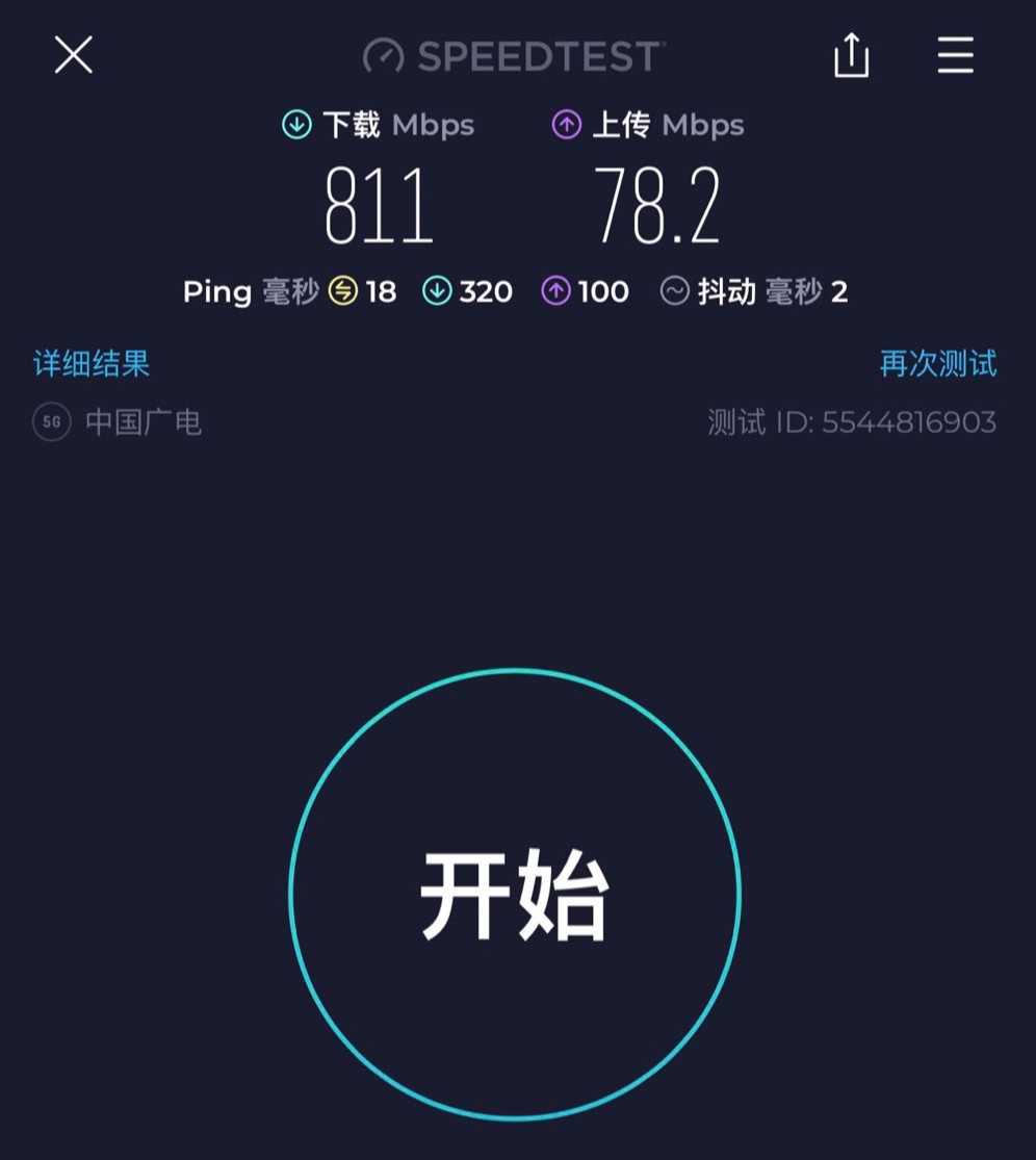 根據網速測試結果,中國廣電 5G 網絡可達到 800Mbps 以上的下載速度。