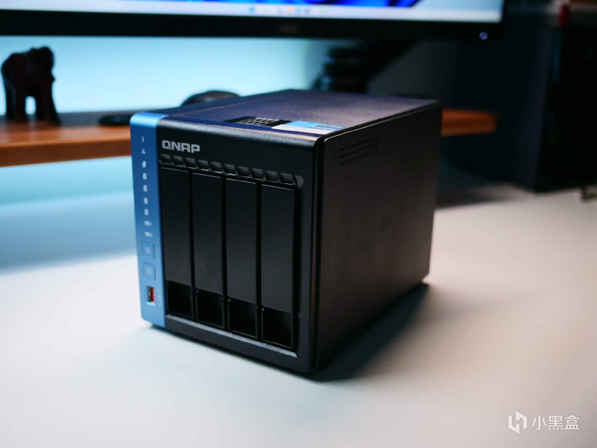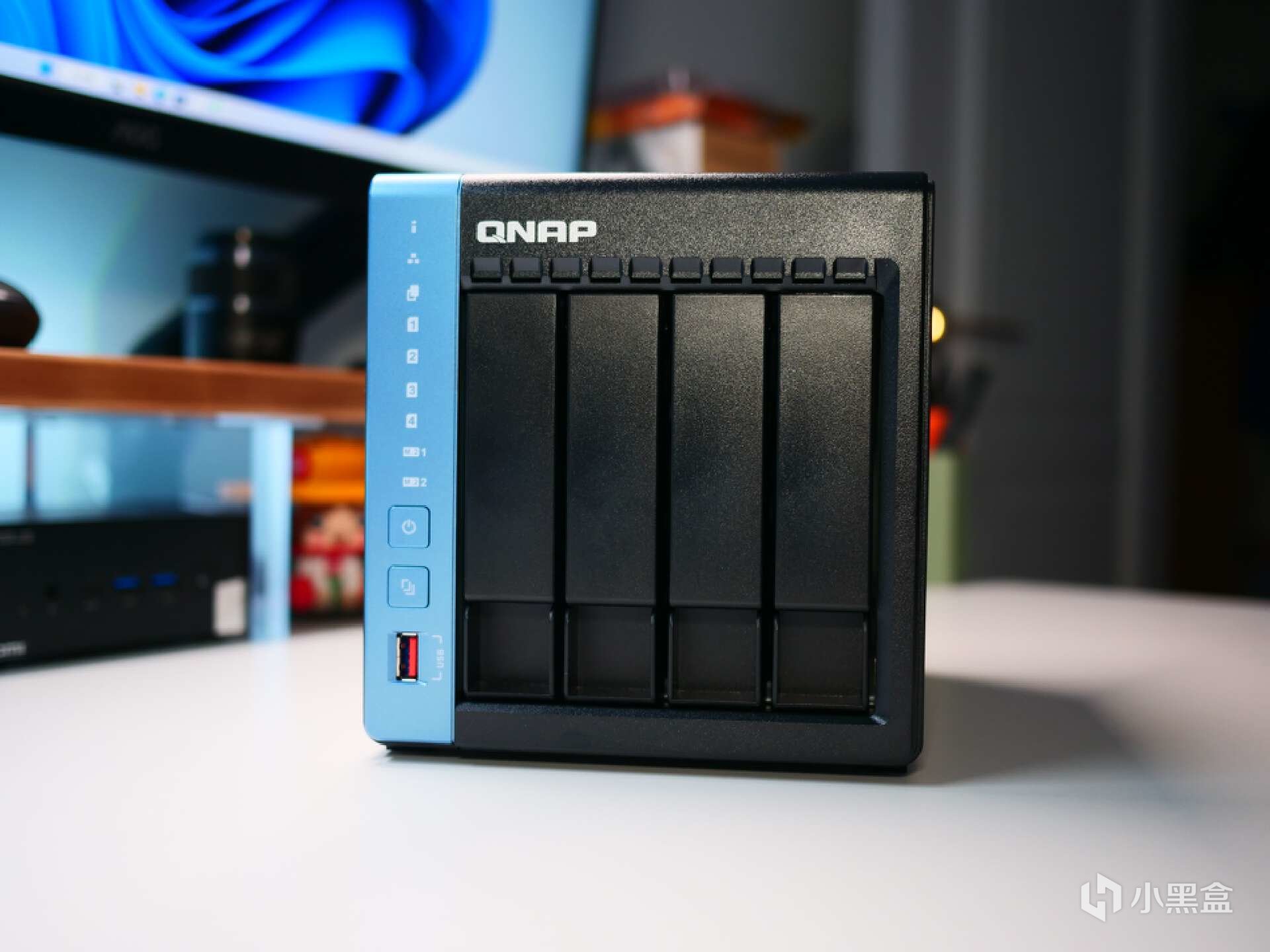 作为威联通家用NAS产品线最新一代的旗舰产品,威联通TS-464C采用4盘位设计,黑色主机略显商务范儿,前面板蓝色的装饰条上分别是状态指示灯、开关机键、一键备份键、以及一个USB3.2 GEN2接口。