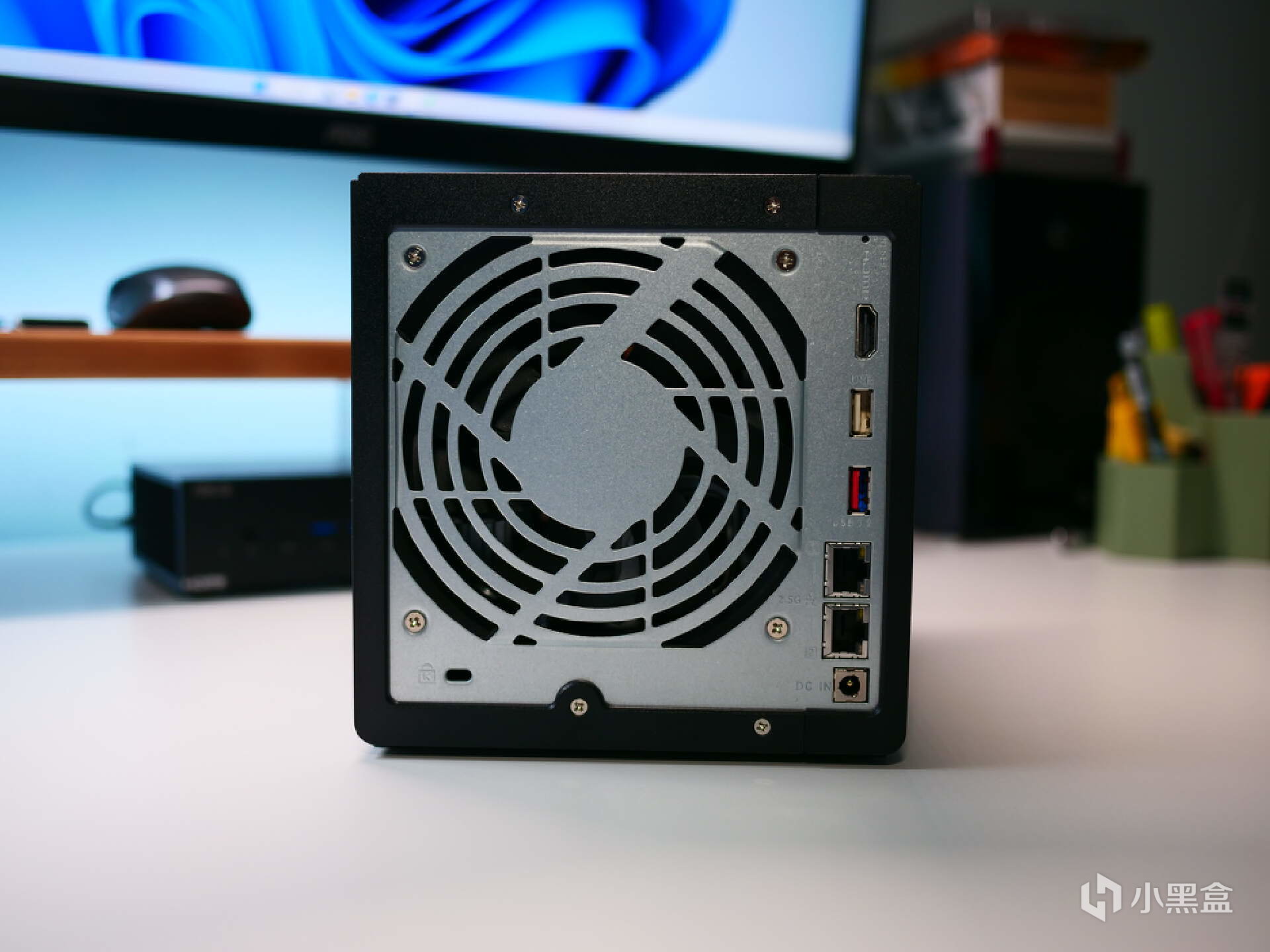 接口上,威联通TS-464C配置了一个HDMI 2.0接口,一个USB2.0接口,一个USB3.2 GEN2接口,以及两个2.5G网口,主机采用DC电源适配器供电,此外还有一个12CM的散热风扇占据了主机背部的大部分空间。