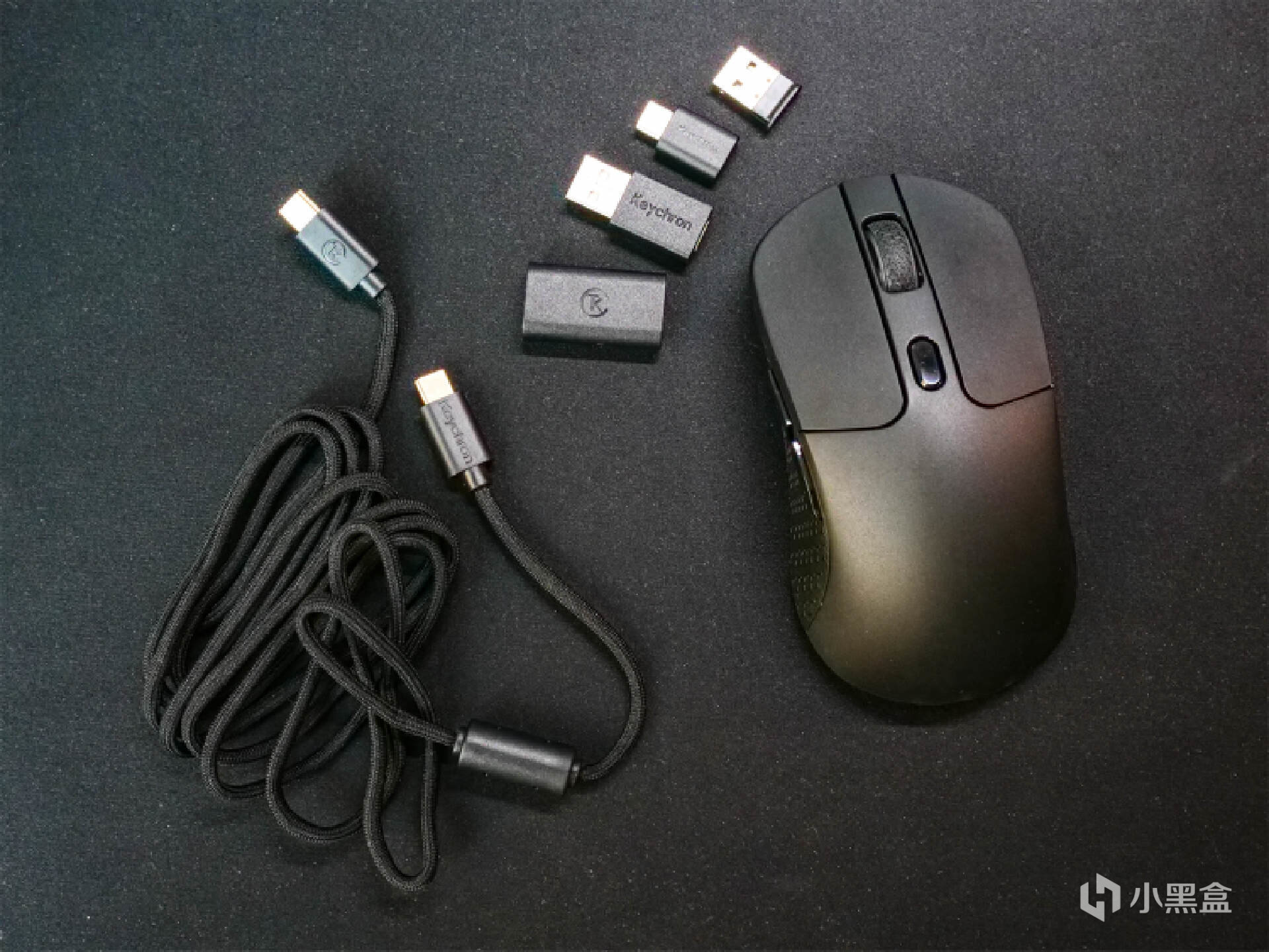 在附件配置上,这款鼠标也给的非常周到,一根双Type-C口伞绳线,USB-A口2.4G接收器和USB-C口2.4G接收器各一,以及两个接收器转接头,方便不同设备用户使用。