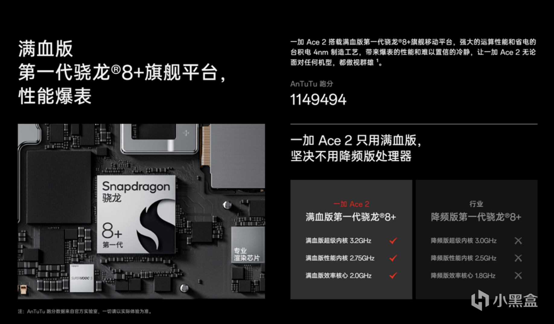 性能也是一加Ace2的一大亮点,作为同价位唯一使用满血版骁龙8+Gen1的机型,相比起普通版骁龙8+Gen1在超级内核主频、性能核心主频、效率核心主频上都要高,是目前骁龙8+Gen1手机中跑分最高的,实测安兔兔跑分达到了111万+,在安兔兔2月旗舰手机性能排行榜上,一加Ace2排名第12,仅次于一众骁龙8Gen2机型。