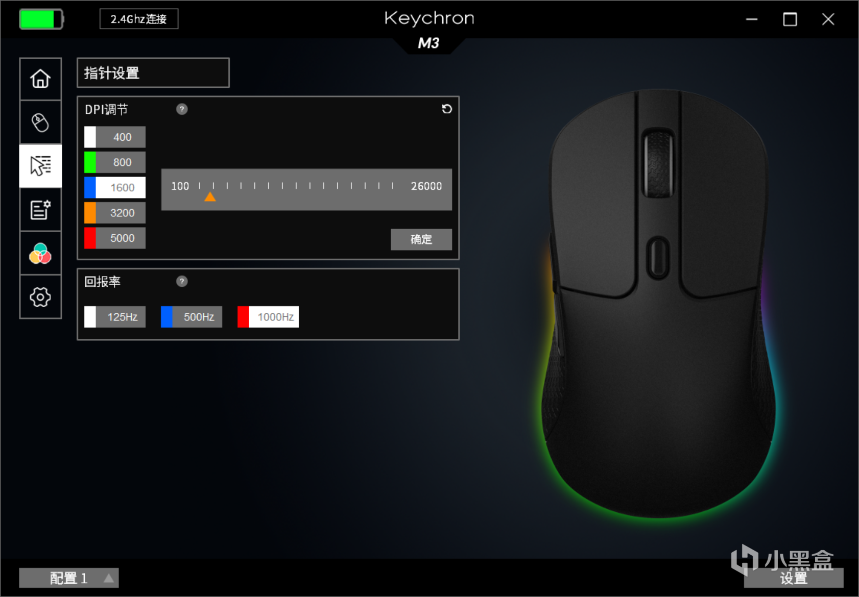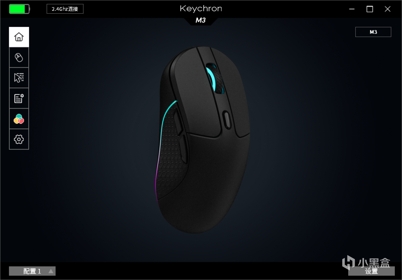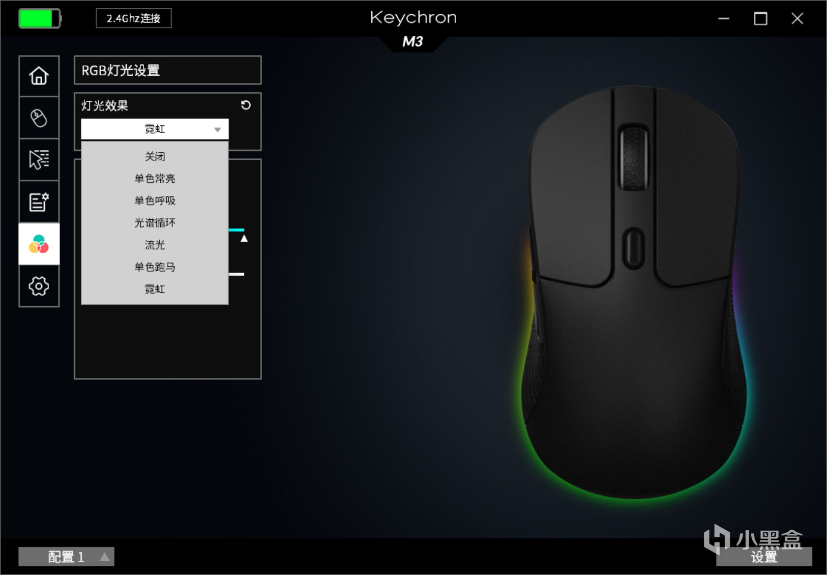 作为一款性能鼠标,Keychron M3在滚轮和侧边配置了RGB灯效,内置6种灯效,可以通过专属的驱动软件进行灯效调节,默认设置下也可以使用鼠标滚轮后的按键进行切换,不得不说Keychron的驱动软件功能上还是非常全面的,玩家通过驱动软件还可以对鼠标的6个按键进行编程。