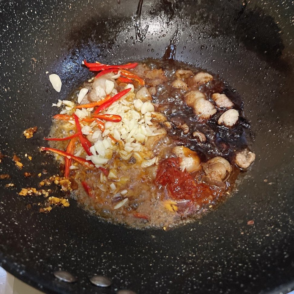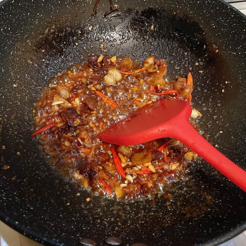 加入豆瓣酱、生抽、蚝油、蒜末、小米辣丝