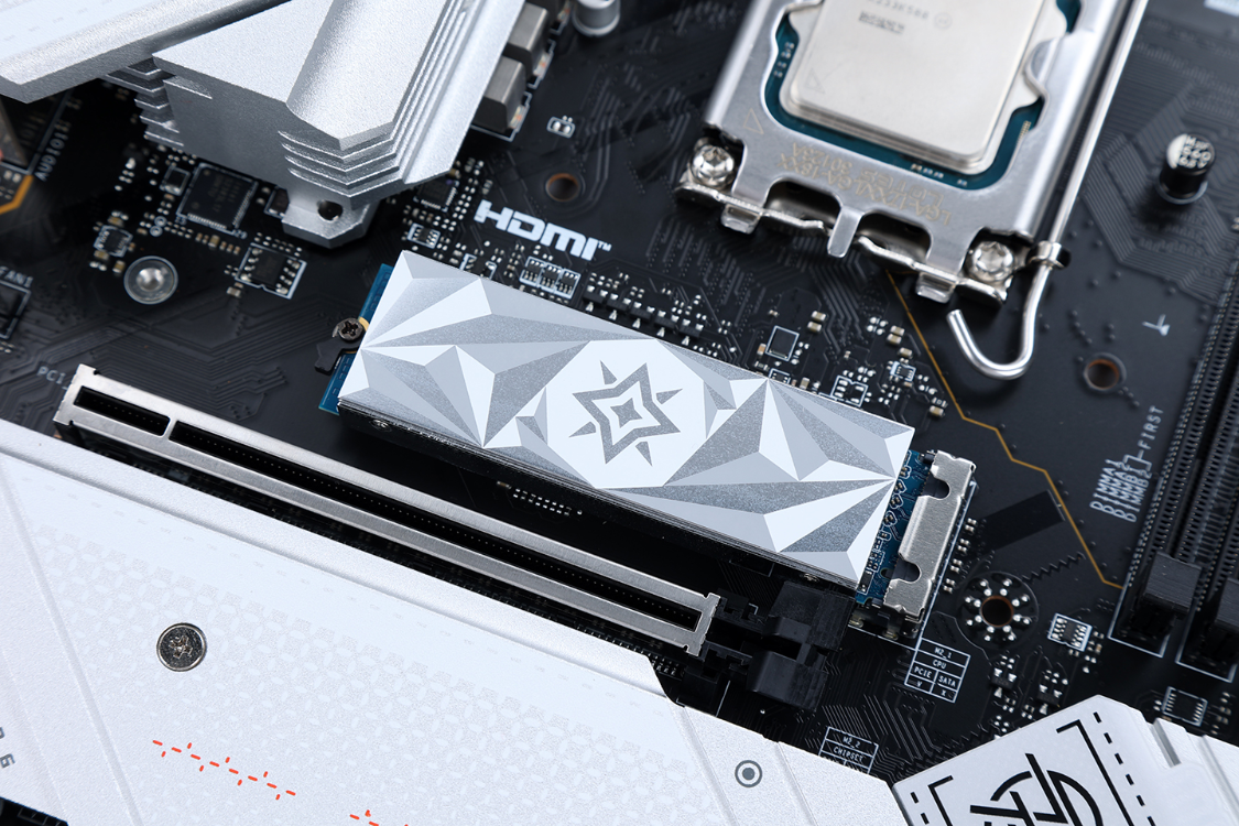 主板配備了5個支持PCIE 4.0的M.2固態硬盤位,均採用快裝設計,近CPU這個插槽金屬散熱馬甲也支持免工具快拆。考慮到生產力需求,這臺機除了配置一塊1T的星曜X4固態,還增加了一路愛4T的西數紫盤做倉庫。