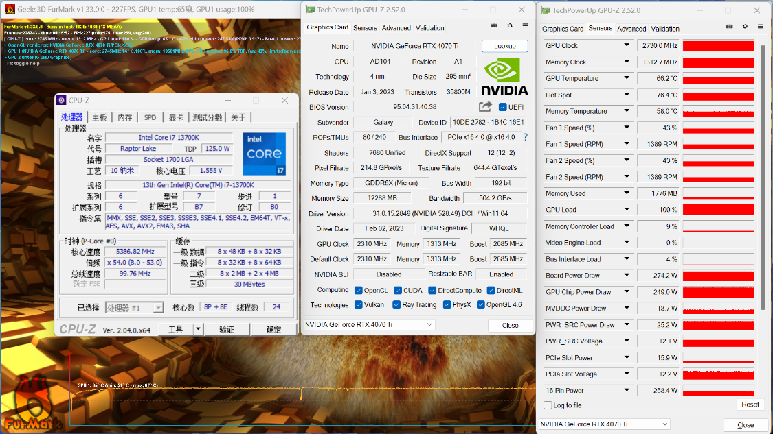 FurMark 甜甜圈顯卡烤機測試,機箱內環境,烤機15Min+,顯卡溫度爲66°左右,顯卡功耗爲275W左右;