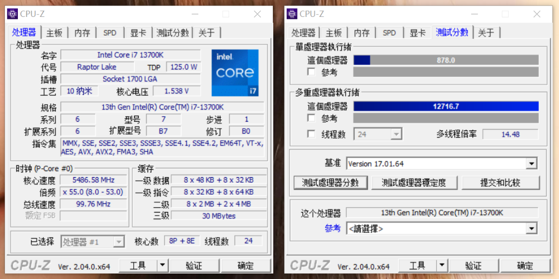 處理器自動睿頻,CPU-Z基準測試,單核得分878分,多核得分12716.7分;