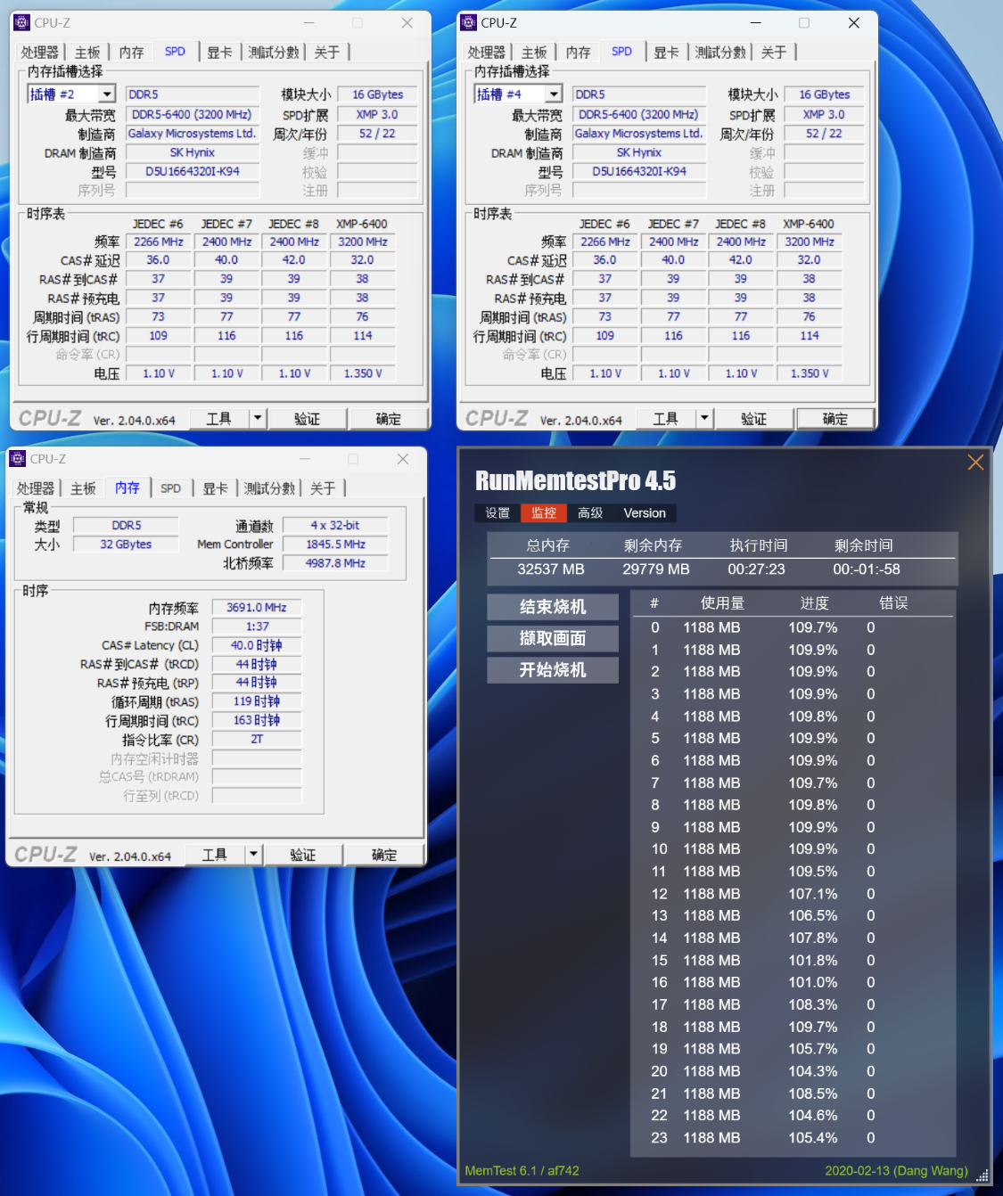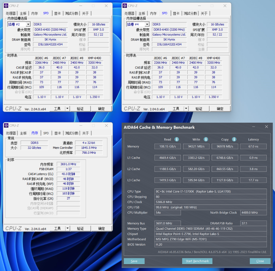 通過Memory Try it將內存OC至7400MHz,內存讀取速度爲108.15GB /s,寫入速度爲94321 MB/s,複製速度爲96978 MB/s,延時爲67 ns;雖然最高拉到了7800MHz,但是烤機不穩,所以不建議。