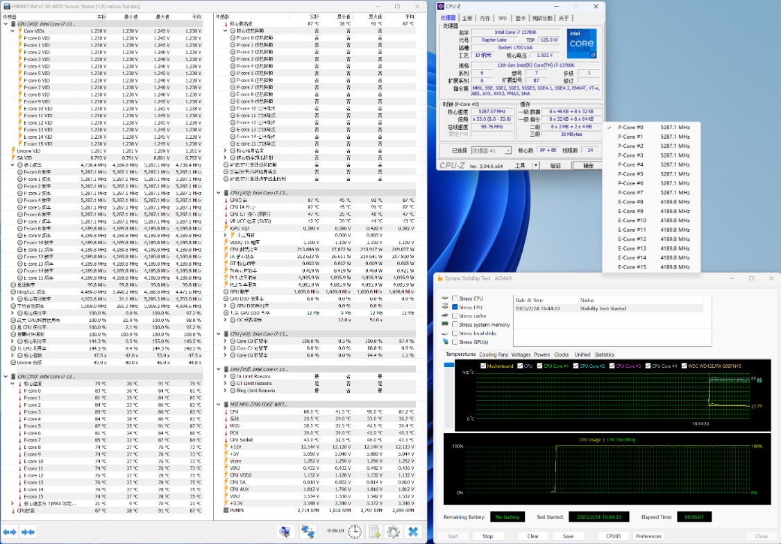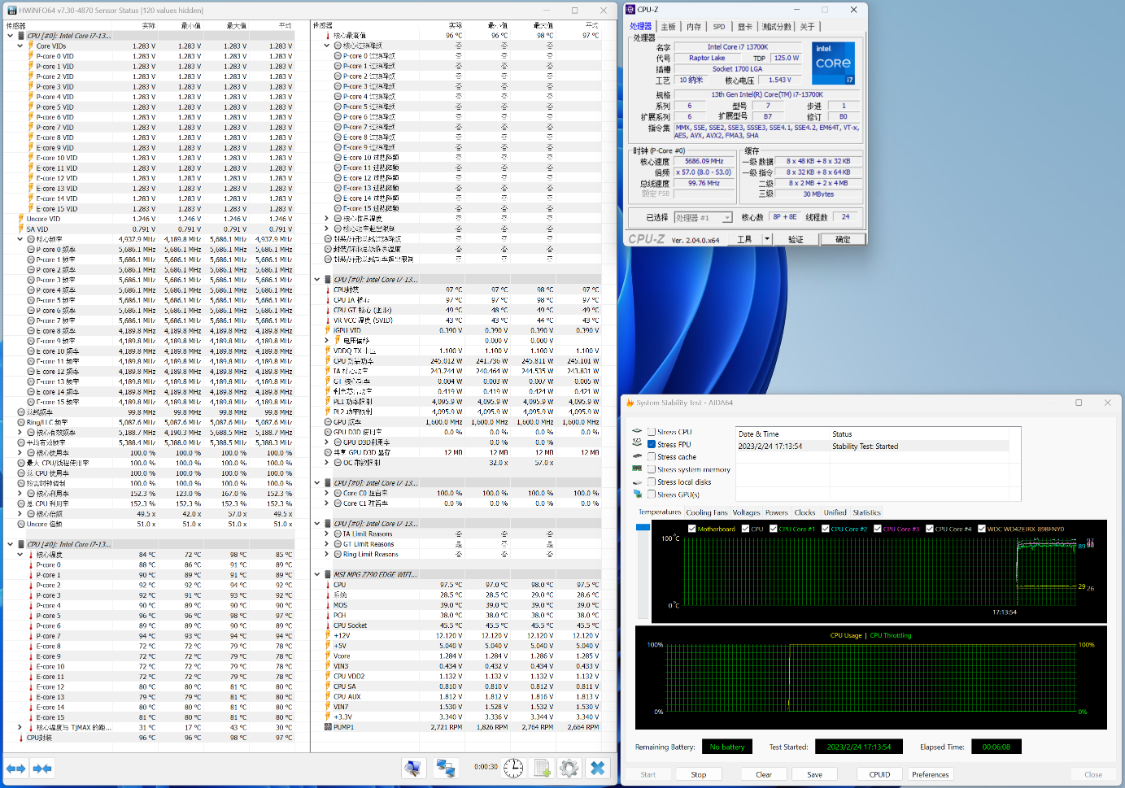 OC至5.7GHz時,烤機5Min+,CPU溫度爲97°左右,CPU功耗爲245W左右,基本穩定運行沒啥壓力。