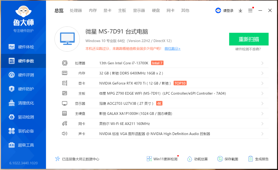 完整配置:i7-13700K處理器、微星MPG Z790 EDGE WIFI主板、影馳RTX 4070 Ti 星曜OC顯卡、星曜DDR5-6400MHz 16G*2內存、星曜X4 1T固態+西數4T機械硬盤、微星MEG 戰神S360一體式水冷、安鈦克DF800 星曜者機箱(白色版)、影馳GL-850金牌全模組電源...