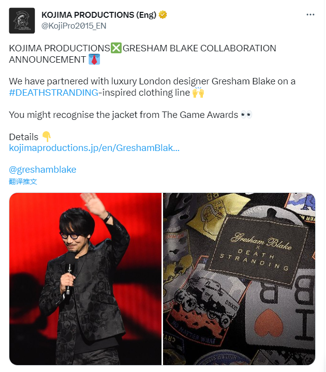 去年,小島秀夫穿著由英國設計師 Gresham Blake 所設計的服飾登上 The Game Awards 2022 頒獎舞臺,當時透露正在製作一系列合作服飾。