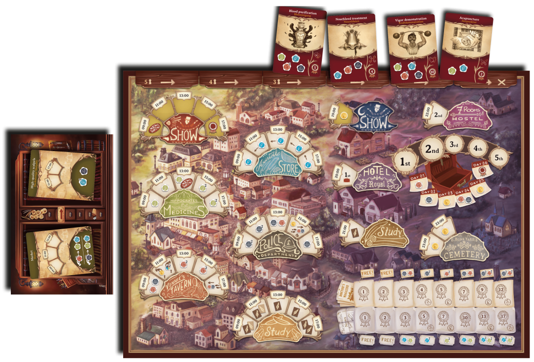 本作一款工放类桌游,游戏的背景设定在19世纪初,玩家将扮演当时的庸医,向容易上当的观众展示医疗表演,竞争成为最有名的医生。
