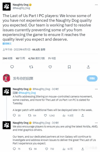 “致《最後生還者第一部》全體PC玩家:我們瞭解到至今還有部分玩家沒有完全體驗到所期望的遊戲,我們的團隊正在努力解決當前的一些問題,以確保質量符合各位的預期。我們將在本週二發佈更新解決鼠標視角移動以及部分崩潰問題。本週晚些時間也將部署一個大型修復補丁。”