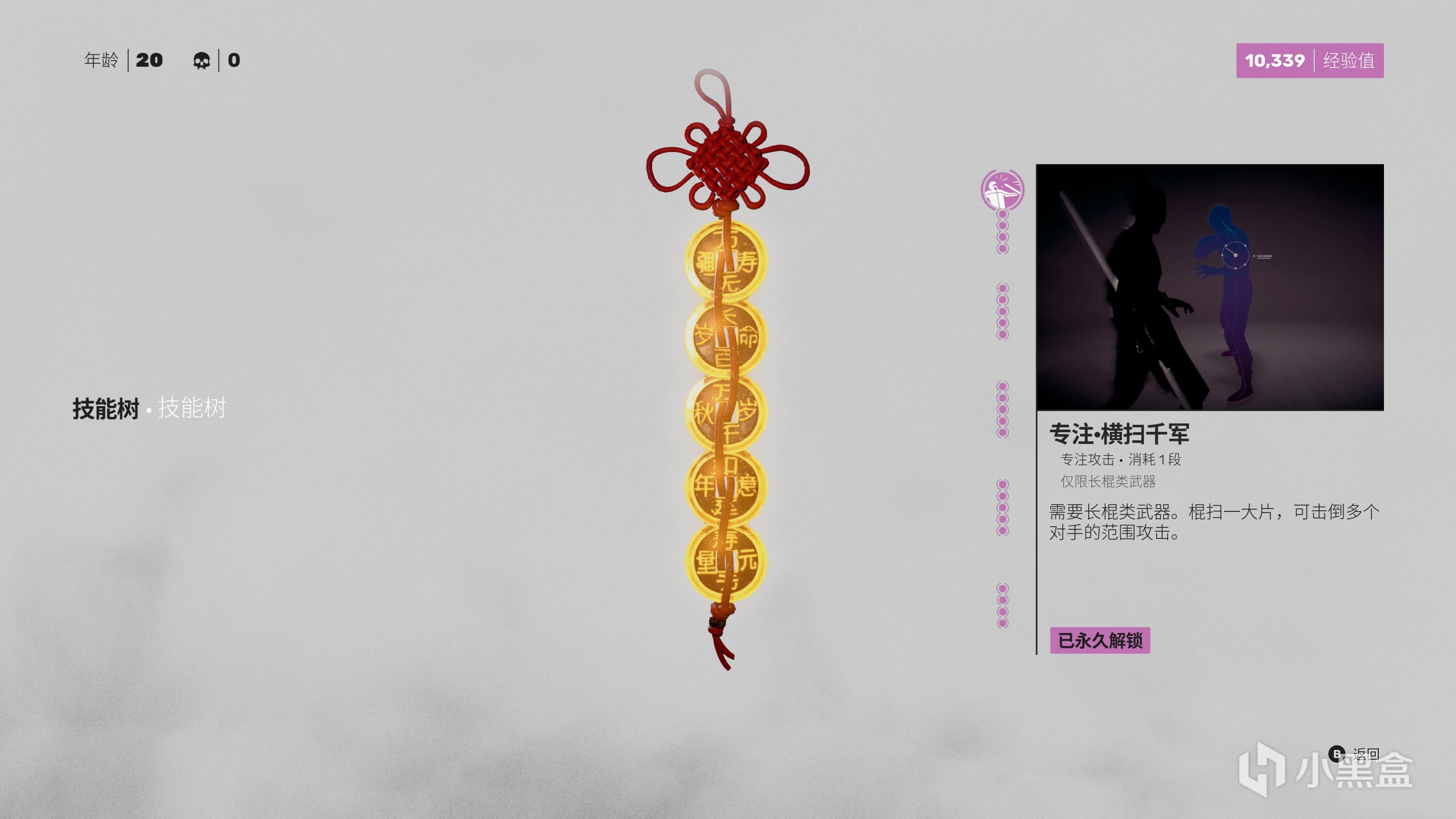 在上文中我們提到升級點,這是在關卡中我們會遇到一些神龕,我們可以對年齡、得分、經驗值方面進行強化,比如25歲前來強化武器耐久度、40歲前來換取復活的血量值、60歲前可以換取一些格擋的架勢條等,分數技能需要分數達標,經驗技能可以解鎖臨時武技。打開技能樹後可以用經驗值解鎖一些招式,花費5倍經驗可以永久解鎖招式,即使70歲永久死亡也可以保留下來。當然沒有永久解鎖的技能在徹底死亡後將不會被保留。
