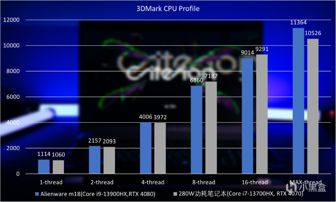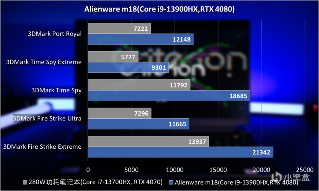 這裏我們先用3DMark的NVIDIA DLSS 3 4K分辨率對滿功耗的GeForce RTX 4070 Laptop GPU和Alienware m18滿功耗的GeForce RTX 4080 Laptop GPU進行對比。可以看到GeForce RTX 4080 Laptop GPU在高分辨率下的收益幾乎是要再翻一倍的。