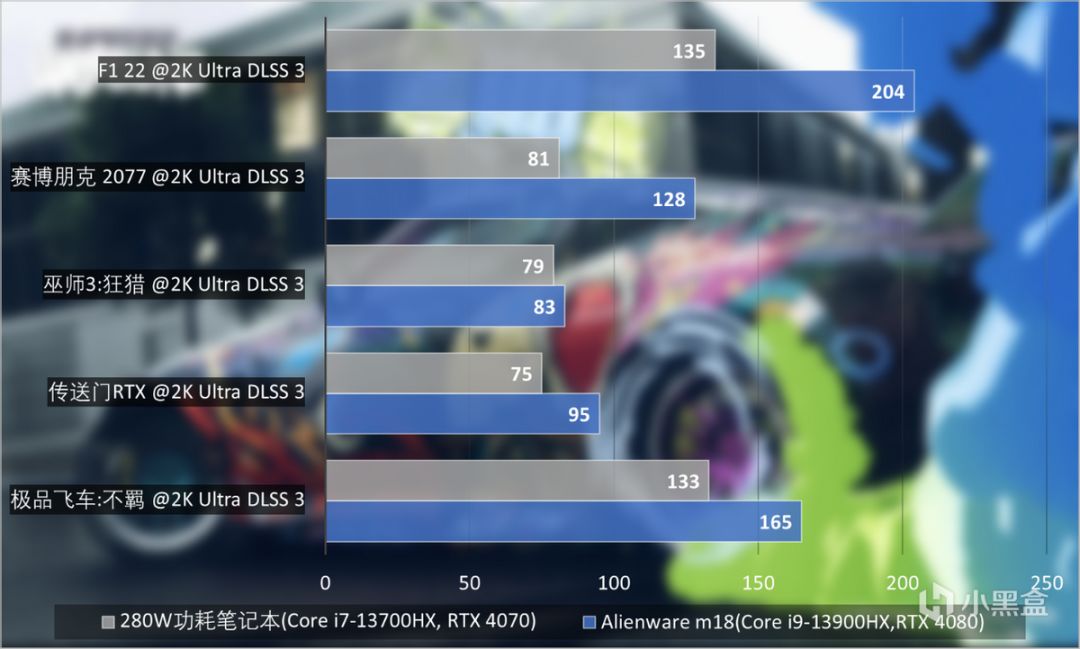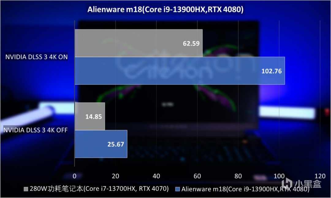因此在支持DLSS 3的遊戲中,可以明顯感受到GeForce RTX 4080 Laptop GPU將遊戲幀率相對滿功耗RTX 4070 Laptop GPU再向上提升了40%以上,一方面得益於Alienware m18對GPU的性能完全釋放,另一方面則是足夠的散熱性能確保了長時間的遊戲體驗。