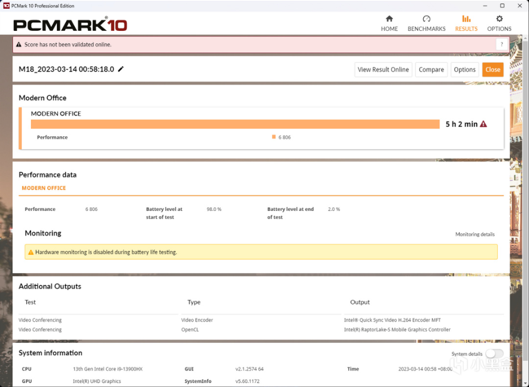 順帶我們也測試了Alienware m18在PCMark 10現代辦公模式中的續航情況,這裏主要將亮度調整到50%,關閉高性能模式,筆記本可以堅持5小時續航,也比主流遊戲本強一些。