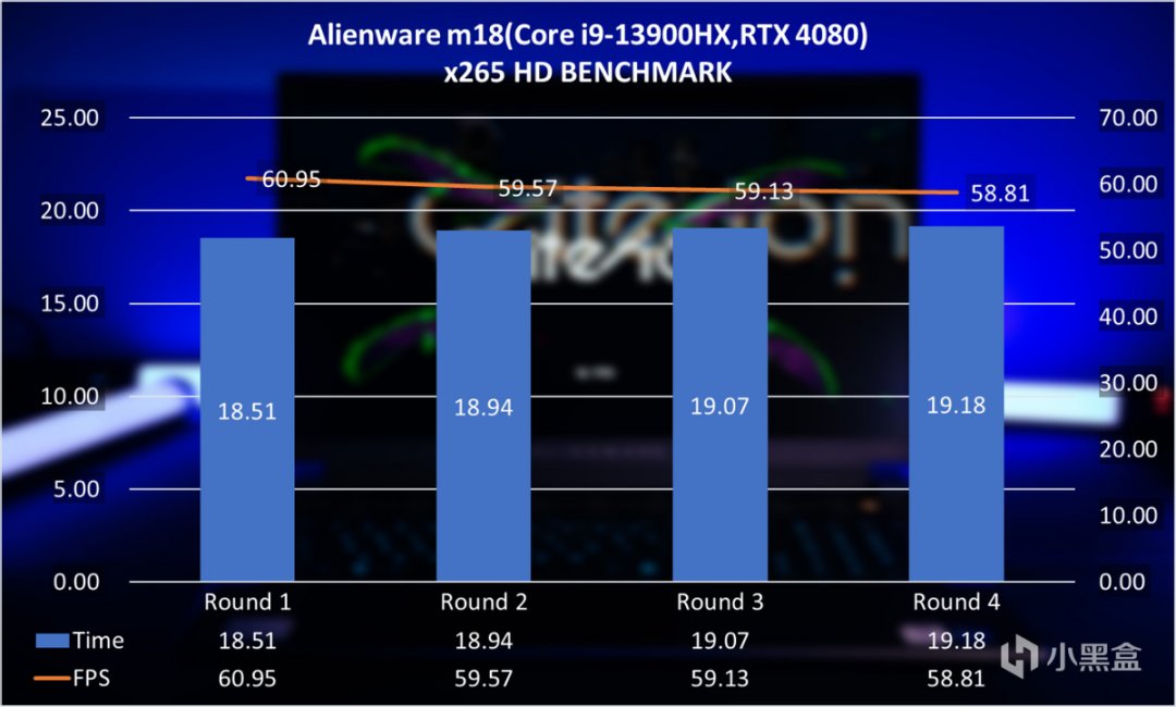 在視頻輸出測試中,利用x265 HD Benchmark對CPU連續4次進行測試,可以看到Alienware m18穩定的性能釋放讓第四次輸出也依然能保持很高的水準。
