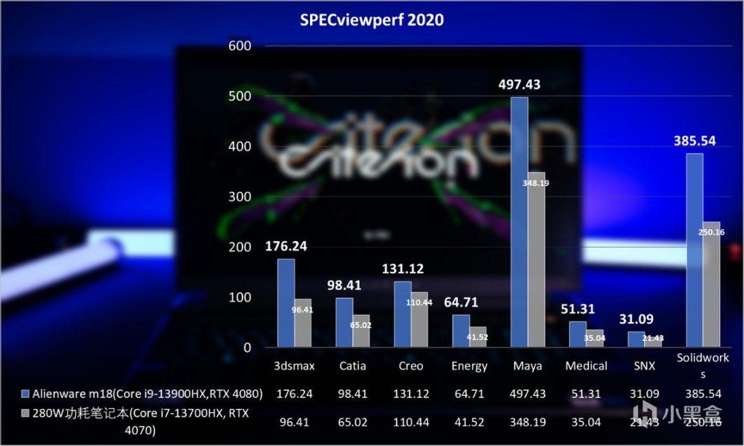 最後是利用SPECviewperf 2020對專業領域軟件進行對比,幀率越高,越流暢,你會發現就連嚴重依賴OpenGL的專業軟件也已經輕鬆在30FPS以上,更有甚者輕鬆接近500FPS,早已是準專業顯卡的表現。