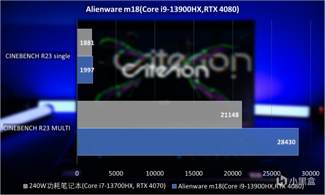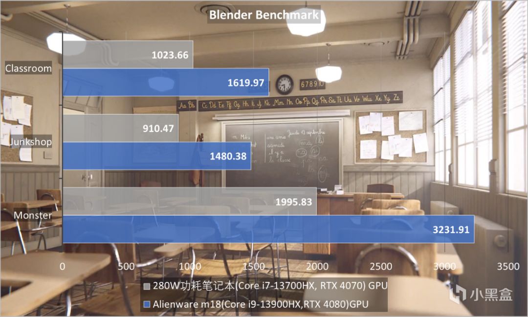 V-Ray 5 Benchmark和Blender Benchmark則同時考驗Alienware m18的CPU、GPU渲染、GPU CUDA、光追性能。對比提升50%到80%,可見更多的線程和CUDA Core的重要性。