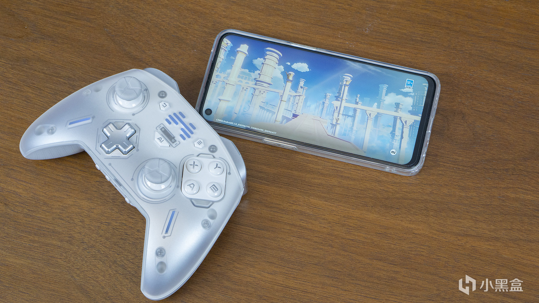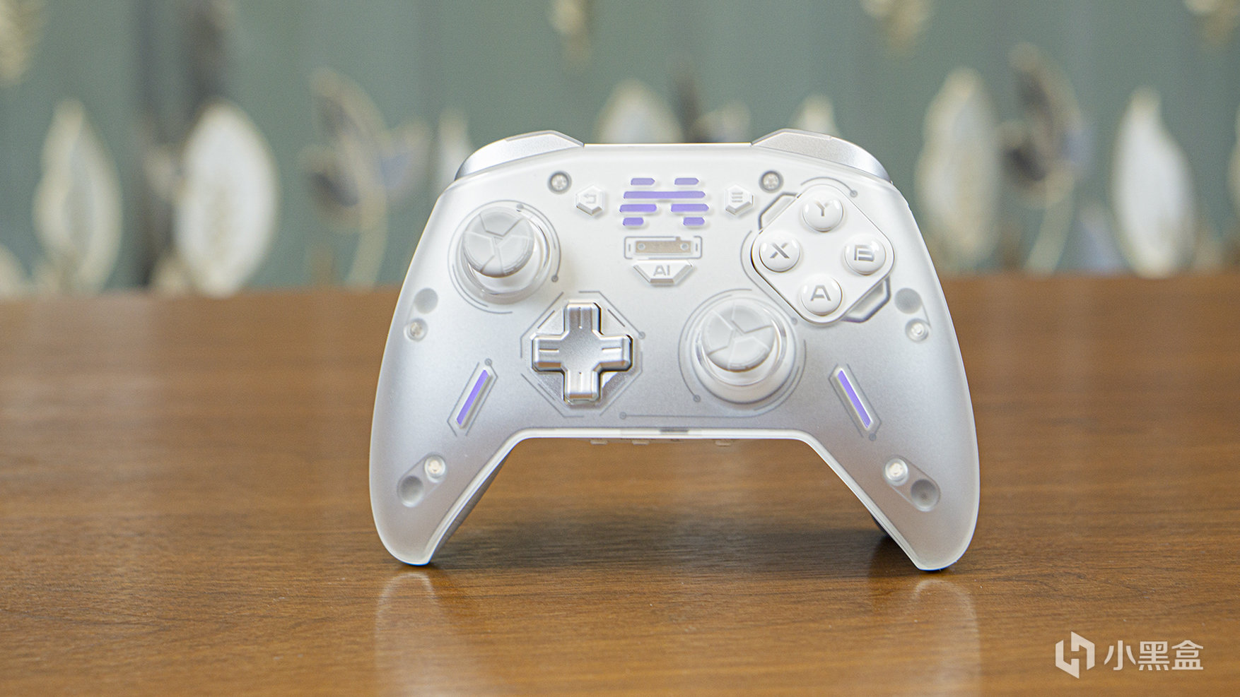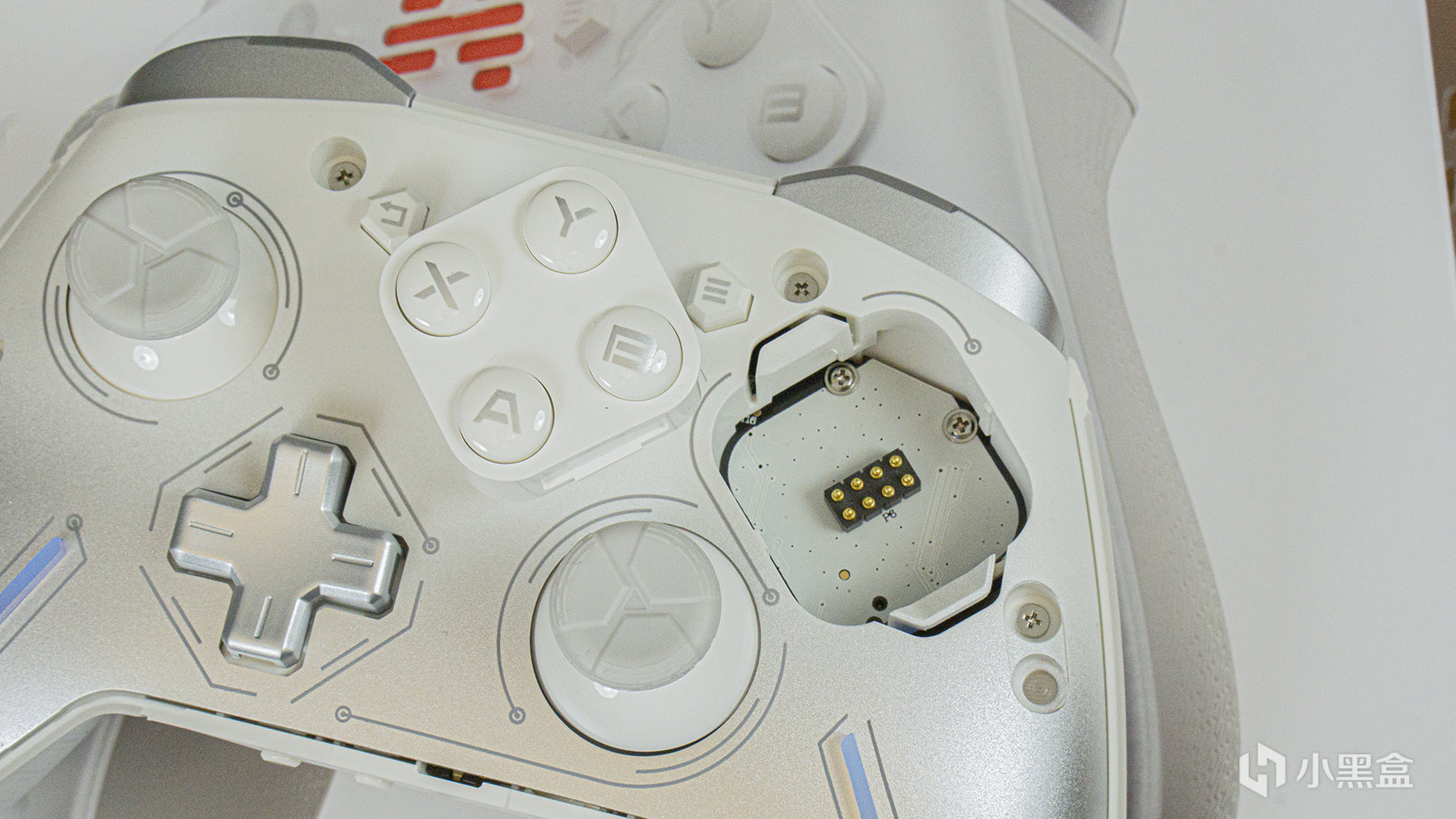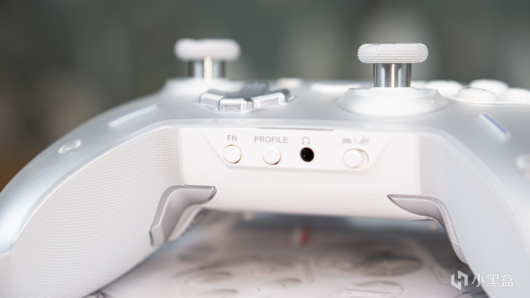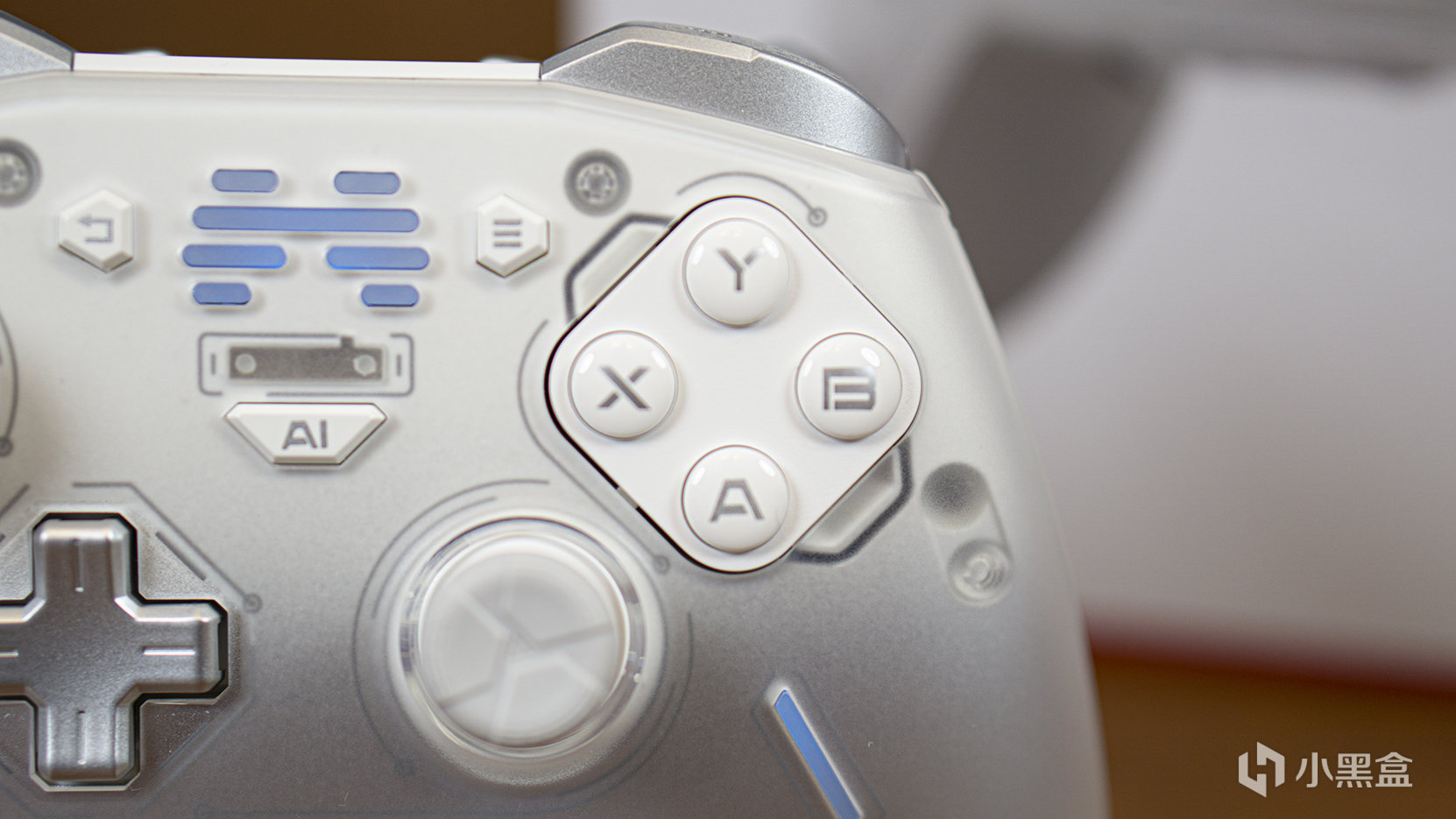 我們所收到的這款手柄是先鋒白板,從正面看,半透磨砂材質的手柄面蓋下面是一個由白到灰漸進的配色,它採用了XBox的按鍵及搖桿佈局,十字鍵和右搖桿的側下方也有兩個RGB燈條。
