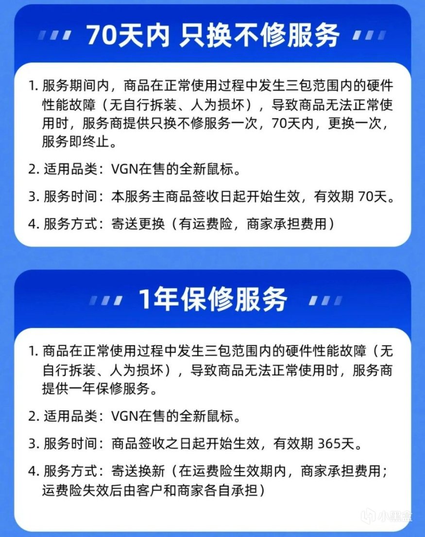 最後,VGN 爲蜻蜓 F1 提供的售後服務是一年保修、70 天只換不修,而熟悉羅技和雷蛇的老玩家應該都知道這大廠的保修期限都是 2 年的,羅技甚至可以做到保修期內都只換不修,非常給力。可以說,VGN 是犧牲一定的售後來降低鼠標售價,其實不止是 VGN,黑爵、達摩鯊、Keychron、雷柏等國產廠家都是如此,所以這些國產鼠標才能做到如此低的價格。