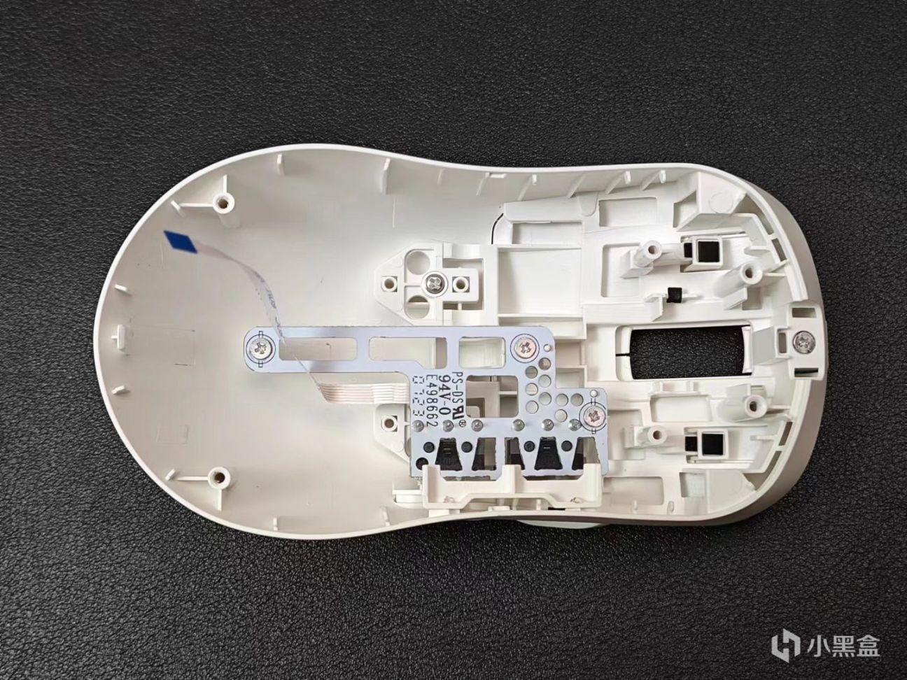 其實把鼠標做輕並不難,常見的方法有把一些硬件配置例如燈光砍掉、縮小 PCB 體積、在空餘的地方打孔、把外殼做薄等等,只是這樣會降低鼠標的強度,很可能出現握持時外殼形變誤觸側鍵、摔後鬆動散架等問題,因此大部分廠家做輕量化基本到 60g 就止步了。而蜻蜓 F1 在做到 49g 的情況下強度竟也相當不錯,得益於加強筋以及優秀的結構設計,除非雙手非常用力捏否則不會誤觸側鍵,有博主暴力測試摔了 40 多回也沒有出現明顯的鬆動,正常使用完全不用擔心。