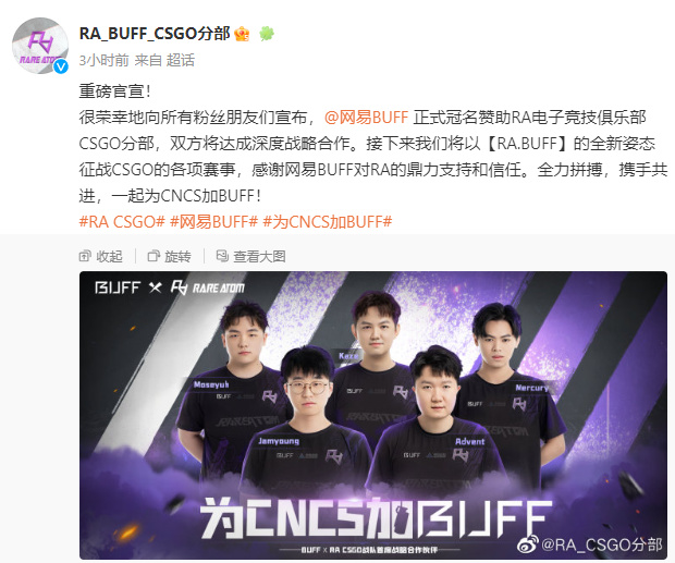 RA CSGO分部的官推正式官宣了與網易Buff的合作,接下來RA將以RA.Buff的名稱征戰各項賽事。