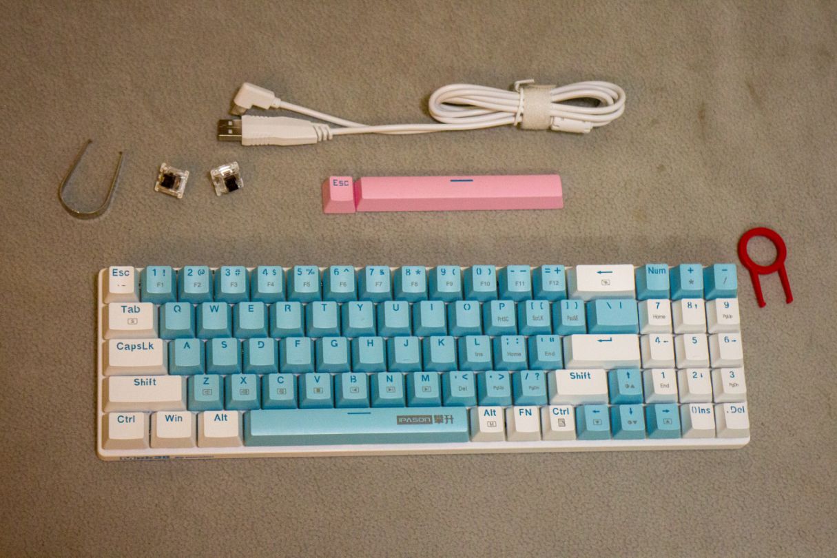 鍵盤1把 粉紅色增補鍵帽2個 1根可插拔的tpc數據線 2個可替換的軸體以及一對拔軸拔鍵器