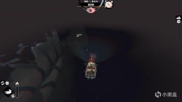 隨着遊戲進程的推進,玩家便無法避免入夜後摸黑出海,或早在之前捕魚的時候忘記了時間在海域呆到了晚上,筆者所要介紹的就是《漁帆暗湧》的理智機制。玩家會因爲在黑暗處逗留太久、碰到怪異的魚類、聽見令人抓狂的私語而陷入癲狂。遊戲上方的眼眶則代表着玩家的精神狀況,越低所看到的奇異怪像就越多,或是突然出現在眼前的礁石、亦或是出現重影,逐漸變得目眩的視野、又或是突然冒出來的海怪觸鬚和準備叼走魚獲的渡鴉,這些都是理智過低帶來的懲罰,提醒着玩家不要在暗處停留太久,理智只有通過休息才能回覆。