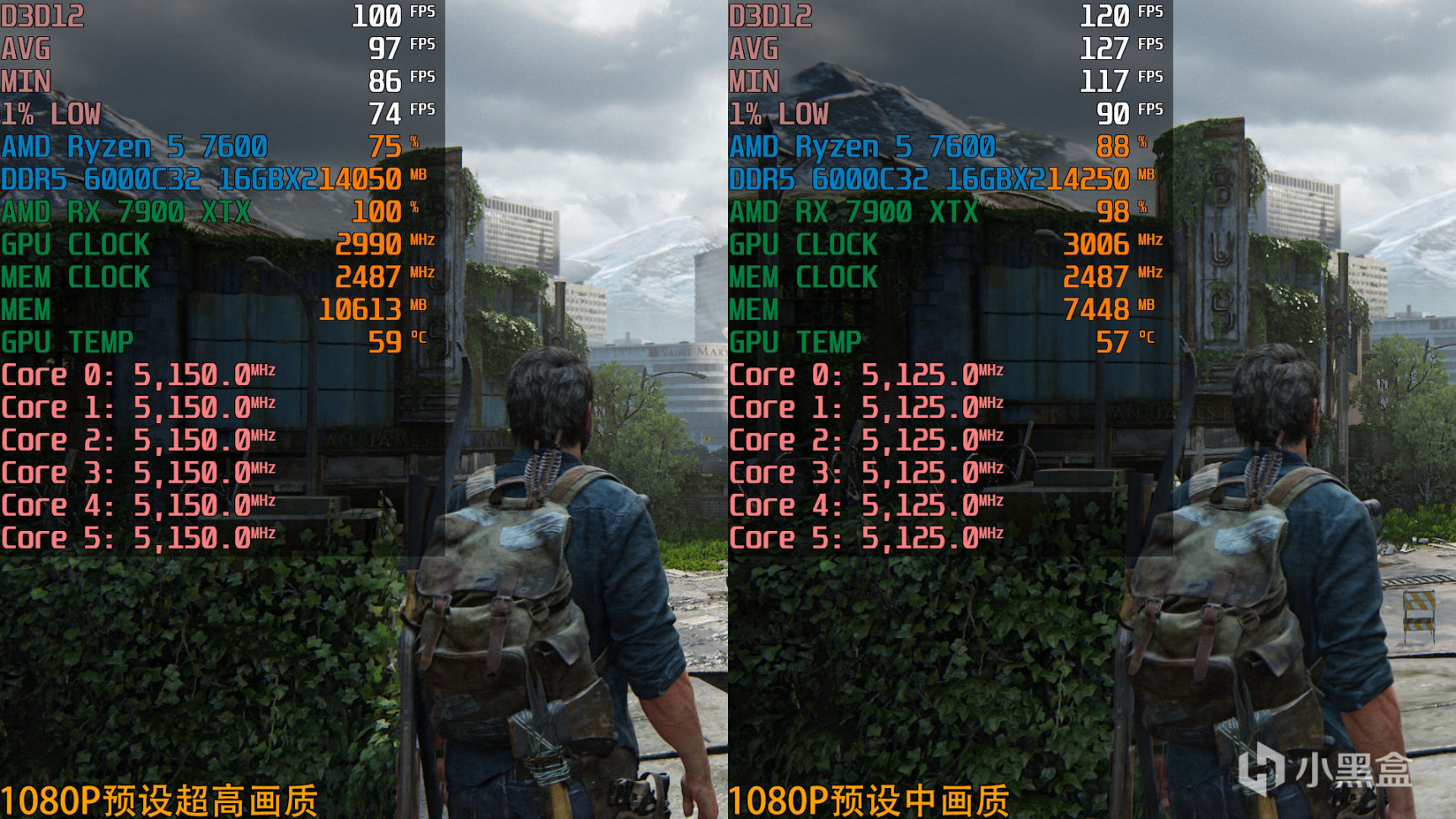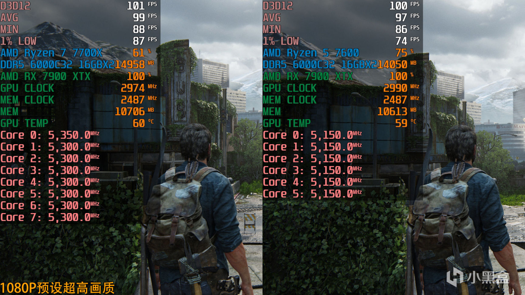 關於CPU性能需求方面,這裏就用Ryzen 7 7700X和Ryzen 5 7600對比了一下,1080P預設超高畫質,搭配RX 7900 XTX這種旗艦級顯卡只有2%差距,但是仔細看Ryzen 5 7600其實整體利用率已經達到75%,這對於一些只有物理六核心的CPU來說簡直是降維打擊。