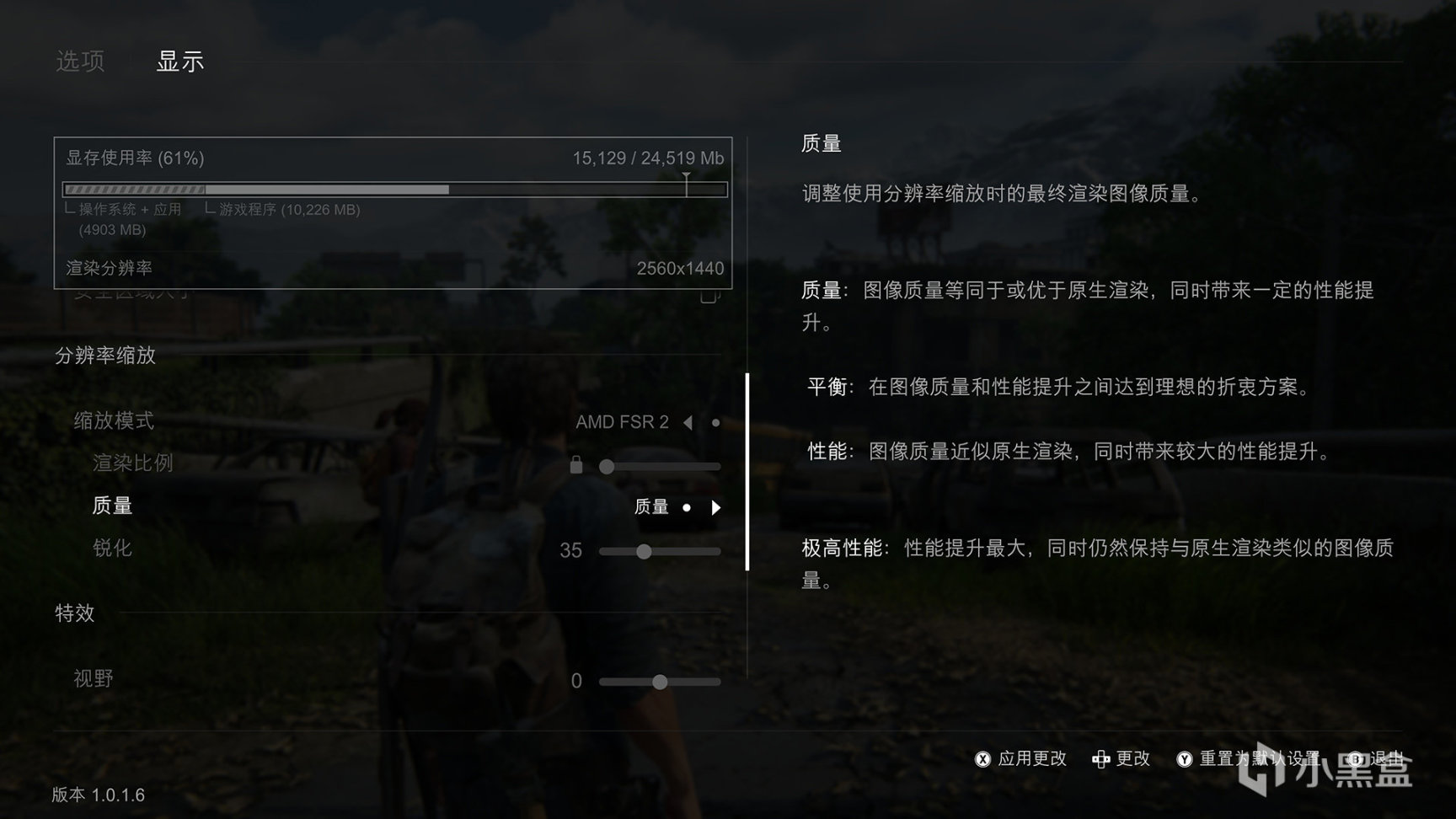 《最後的生還者:第一部》重製版採用的是續作同款引擎(代表着頑皮狗最強技術),和PS4 PRO上的高清版可不是一回事,遊戲確實是比較喫顯存了,甚至比最近發售的《生化危機4:重製版》還要佔用更多顯存,個人建議是能開FSR 2或者DLSS 2就一定要開,可以適當降低顯存同時也能帶來不錯的畫面和幀數提升,更大衆的FSR 2方面支持質量、平衡、性能和極高性能四種模式,後面有對比原生畫面環節,就知道爲什麼一定推薦大家要使用。