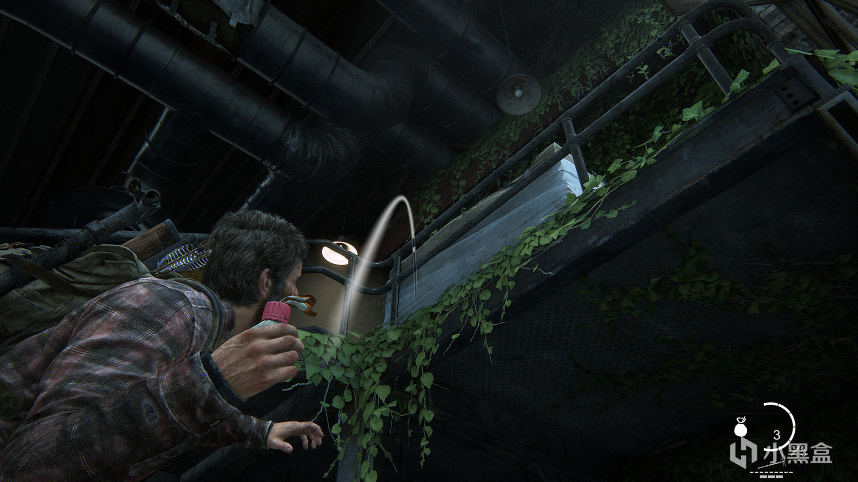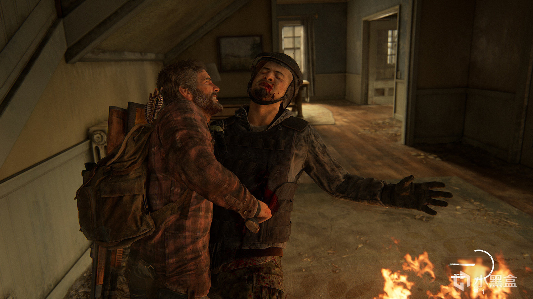 運鏡雖然不是《戰神4》那種一鏡到底的,但是頑皮狗依然很擅長運用運鏡來展現劇情當前的人物關係和狀態,尤其是CG即時渲染過渡到玩家操控視角,體驗是非常絲滑流暢的,並且也存在合理數量的QTE機制來增強沉浸感,這就是鏡頭語言的魅力了。除了《最後的生還者》以外,旗下的《神祕海域4》也是這種形式,它們倆都有一個共同點:UI界面最大程度簡化。