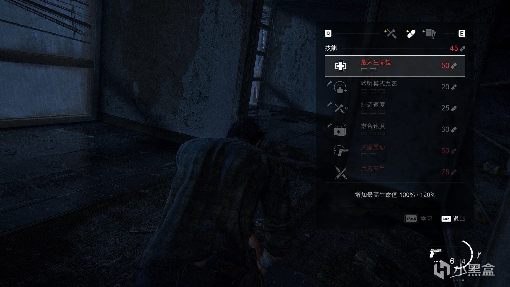 人物被動技能升級方面就簡單多了,一般情況下都是優先堆生命值,然後掂量一下自己的射擊水平是否升級武器晃動,聆聽模式距離可以根據你選擇的遊戲難度而定,其他還是按照個人喜好來就行。從武器、道具和技能三大升級機制可以發現,這款遊戲是極其看重資源搜刮環節的,作爲線性遊戲來說還算輕鬆。