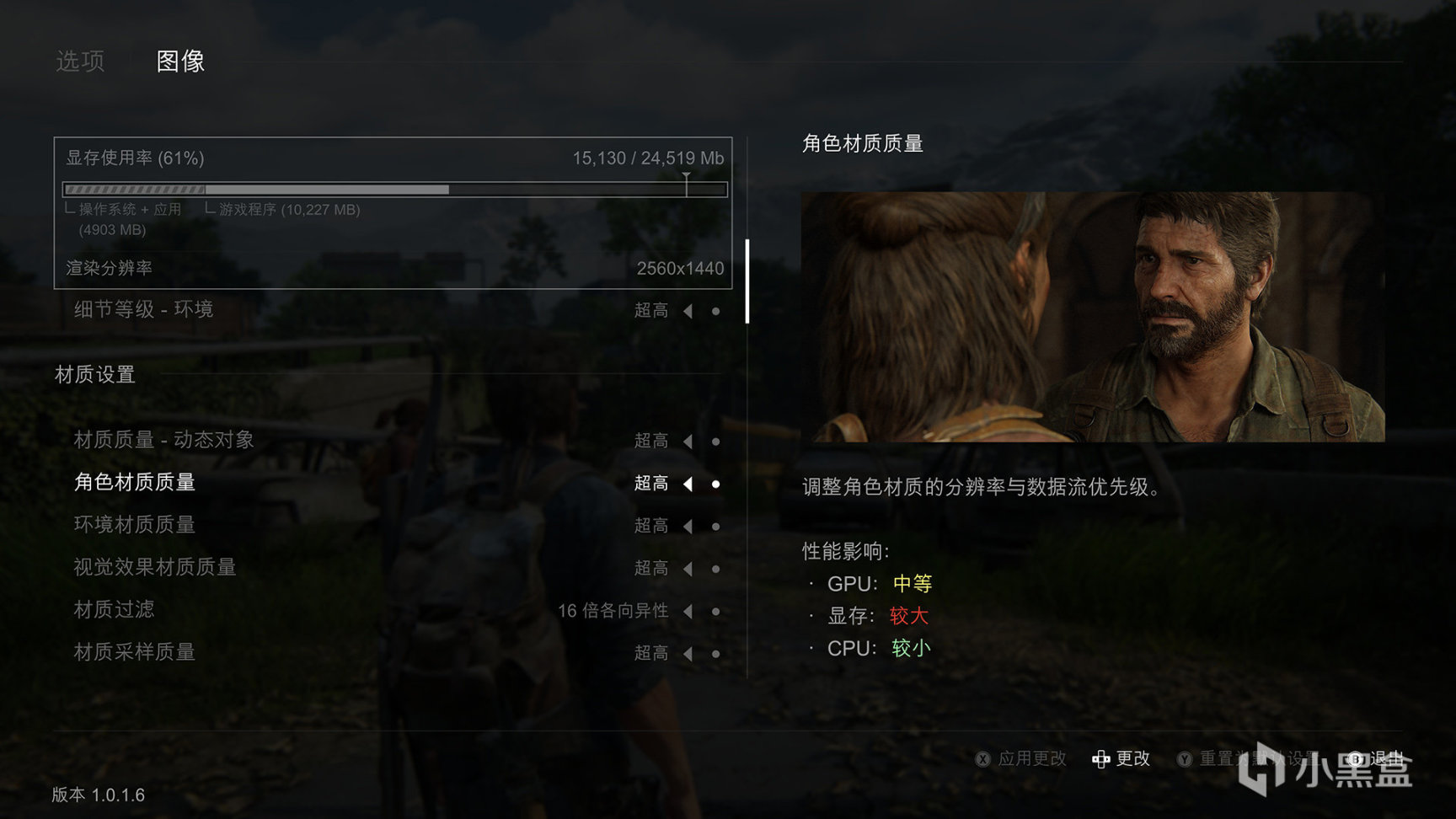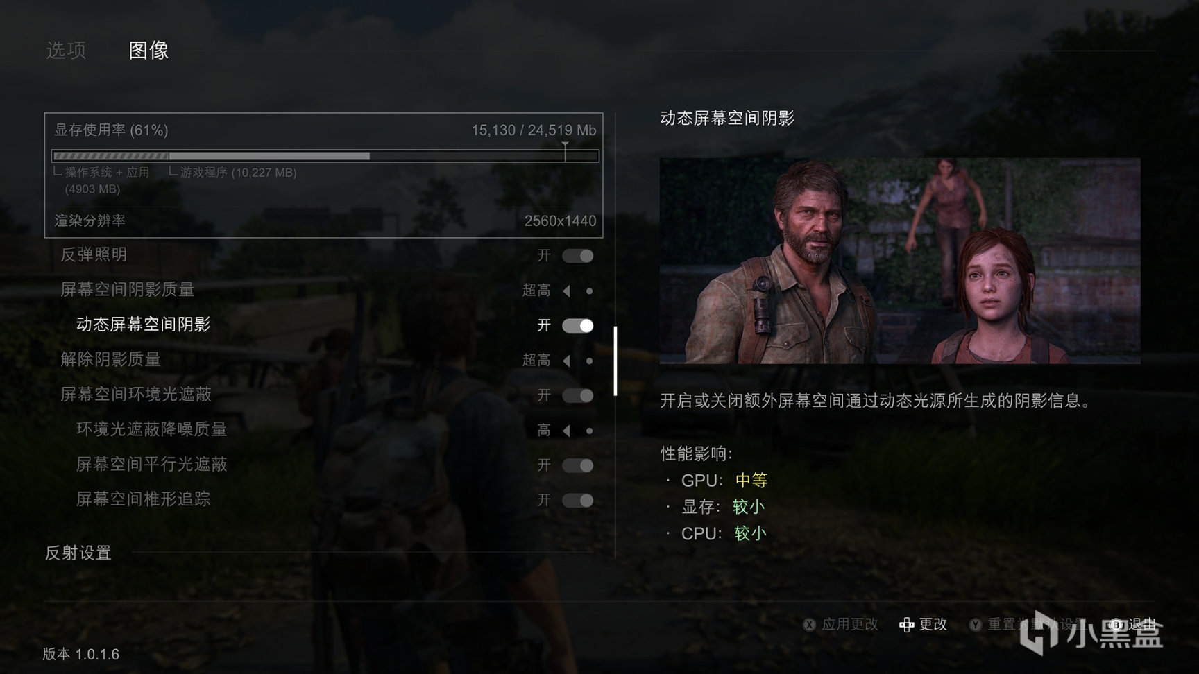 遊戲存在動態屏幕空間陰影、光暈分辨率、屏幕空間反射精度等精細選項——再次給我們展示頑皮狗最強技術,進一步看,遊戲整個圖像邏輯設計就像此前《漫威蜘蛛俠》PC版本,提供了顯存使用率進行輔助,而且每個選項給出GPU、顯存和CPU性能影響程度之餘,調節之後的效果也是可以即時呈現的,大大方便了玩家對圖像設置進行自定義操作,這一點還是值得讚揚的,因爲你會發現沒幾款3A遊戲會做這些人性化的處理。