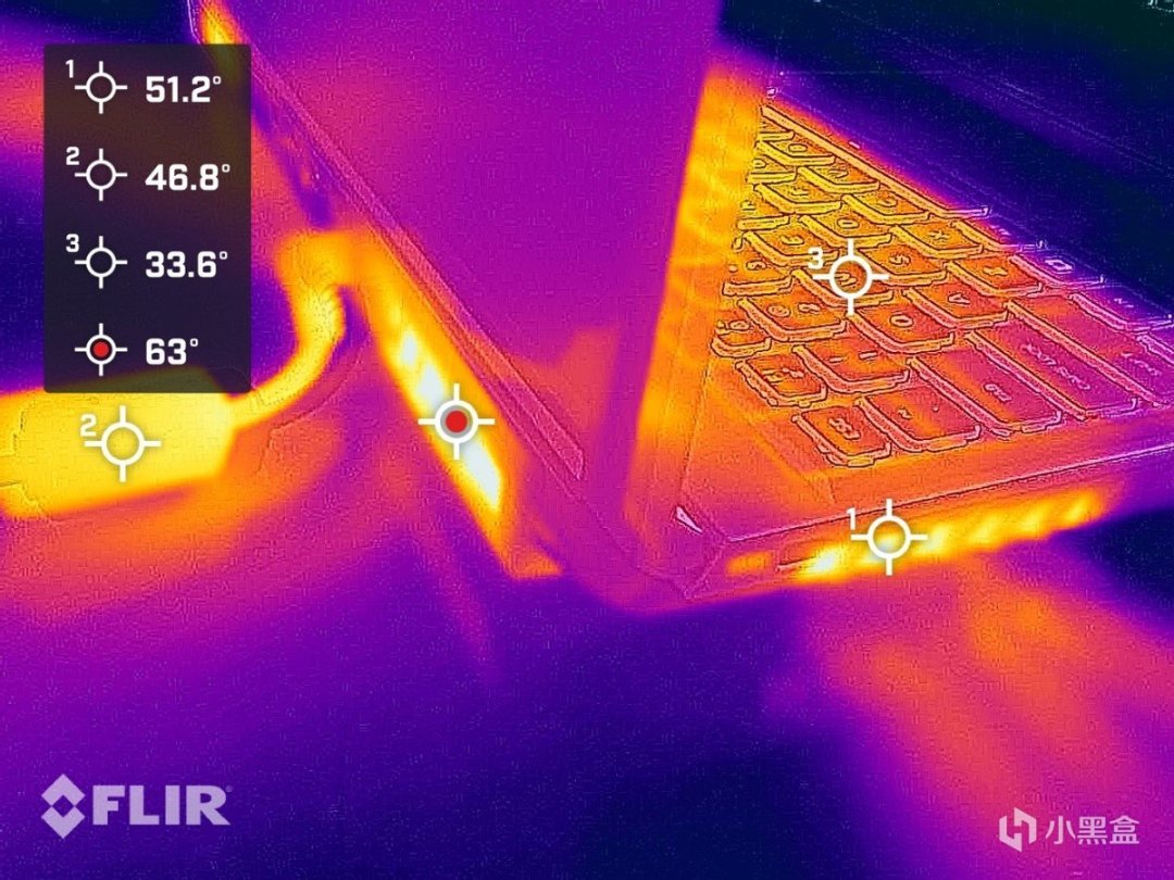 如果從側面觀察則可以看到出風口溫度可以達到63℃左右,並且考慮到機械革命極光Pro背面鏤空的散熱設計,盛夏的時候也可以爲筆記本添加一個散熱墊。
