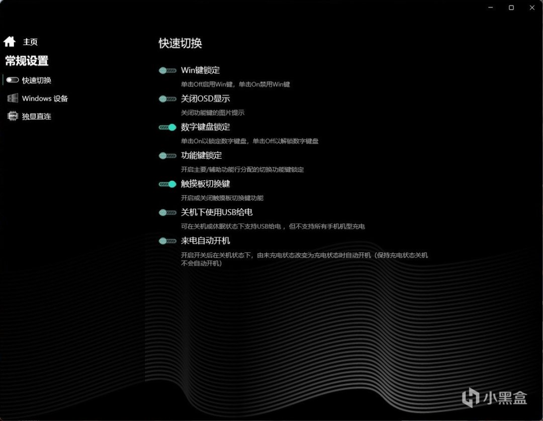 同時,機械革命極光Pro的模式切換還能還可以在機械革命電競控制檯中自定義和調整,在控制檯中,還能設定Win鍵鎖定、OSD顯示、USB充電、獨顯直連等多個選項,並且還能調整1600萬色RGB鍵盤背光。不過可惜的是機械革命電競控制檯似乎沒有默認的快捷鍵快速啓動,需要自行在開始菜單中查找。