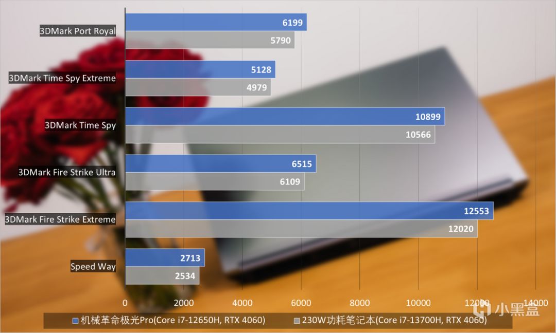GPU測試部分我們則選用了3DMark Speed Way、3DMark Fire Strike Extreme、3DMark Fire Strike Ultra、3DMark Time Spy、3DMark Time Spy Extreme、3DMark Port Royal作爲參考。可以看到Core i7-12650H + RTX 4060 Laptop GPU的表現同樣可圈可點,甚至比一些趨向於輕薄調教,但同樣是230W功耗調教的13代酷睿筆記本更勝一籌,屬實讓人有些意外。