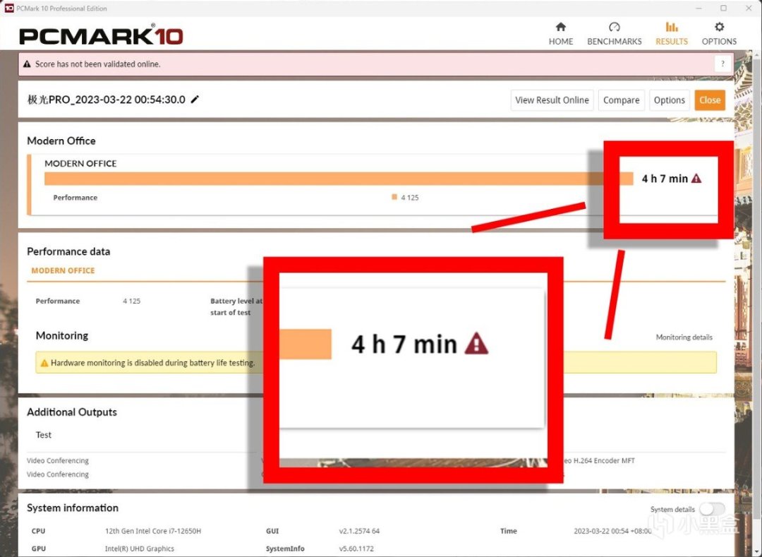 在筆記本的續航表現中,在辦公模式下將筆記本屏幕設置成50%,運行PCMark 10的現代辦公模式,獲得的續航時間爲4小時左右,可以看出筆記本自帶的電池容量不大,從而減輕了筆記本體積,不過對於機械革命極光Pro追求性價比的目標用戶而言,4小時的續航不是什麼大問題,畢竟可以帶着更小尺寸的SiC電源出門,一勞永逸解決續航焦慮。