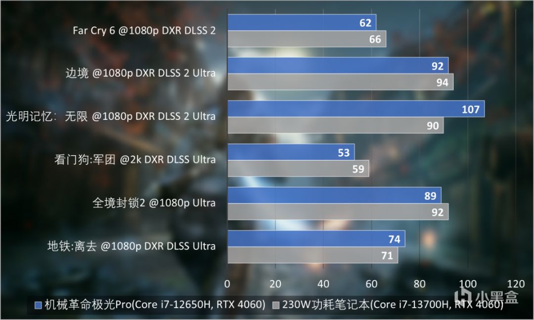 基礎測試的優秀表現同樣也延續到實戰中。按照慣例我們先對早期支持DLSS 2.X和DXR遊戲進行測試,同時也找來一款筆記本作爲陪跑,需要注意的是筆記本之間的設定和定位是有差距的,這裏僅用作性能對比參考。