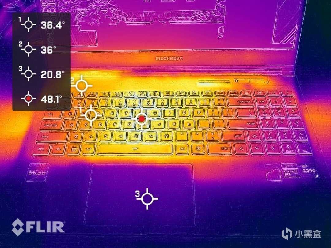 在環境溫度22℃室溫內,筆記本C面的最高溫度爲48.1℃,在GH按鍵下方,觸控板和掌託則保持足夠清涼。