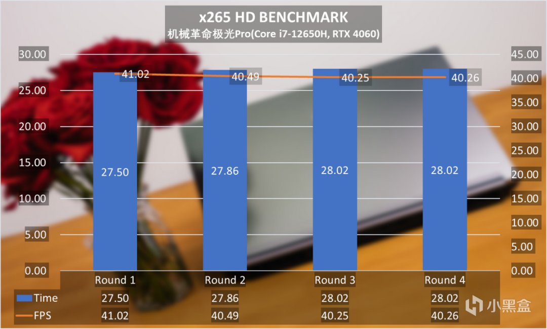 最後是連續四次x265 HD BENCHMARK檢驗筆記本的視頻輸出能力,四輪之後性能下降不明顯,從而也證明了機械革命極光Pro持久的創作能力。