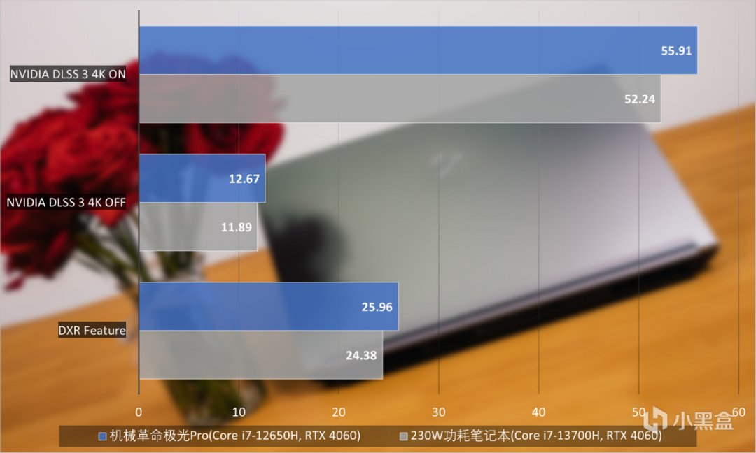 同樣在DXR Feature和DLSS 3的測試中,RTX 4060 Laptop GPU的性能釋放也非常亮眼。