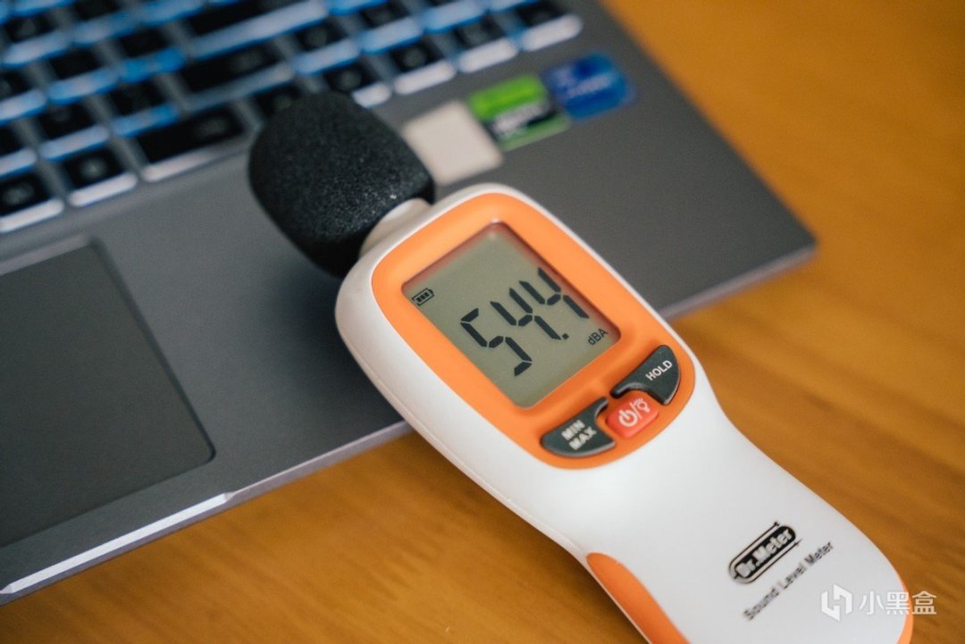 不僅如此,機械革命極光Pro的散熱架構也給人留下的很好的印象,機身內部由5根熱管、雙風扇和四出風口組成,即使是在狂暴模式下,風扇噪音柔和,爲54.4dB左右,沒有刺耳感。