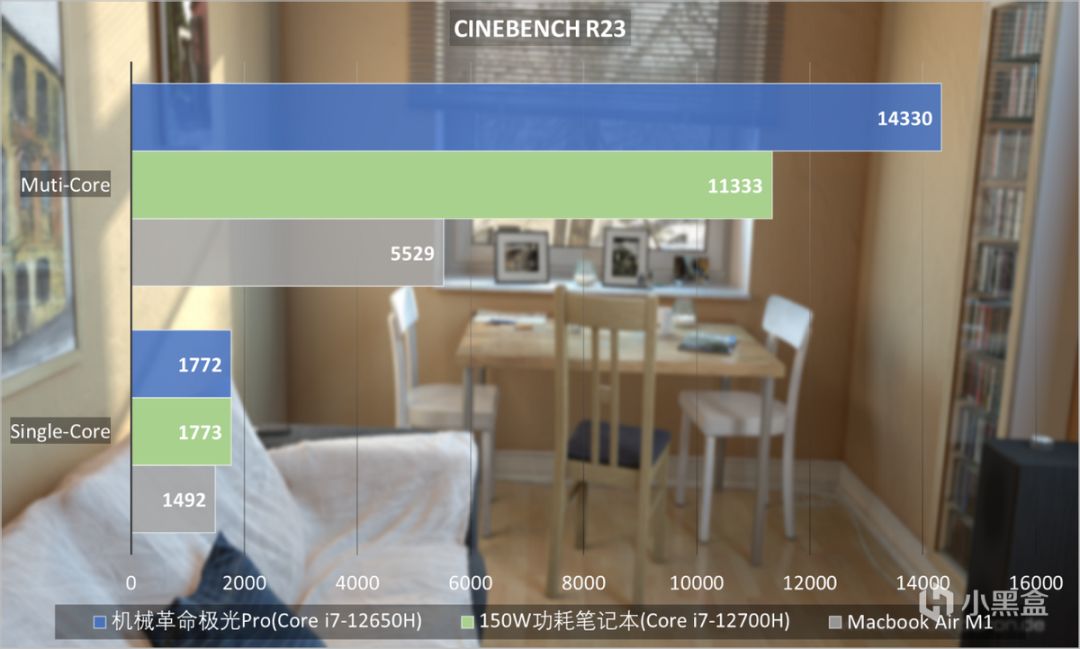 在檢測CPU基礎測試中,可以看到Cinebench R23上的單線程和多線程表現,不僅優於同時期的Apple M1,也比150W功耗筆記本的Core i7-12700H強力不少,也足以見得機械革命極光Pro已經很好掌控了這塊CPU的特性。