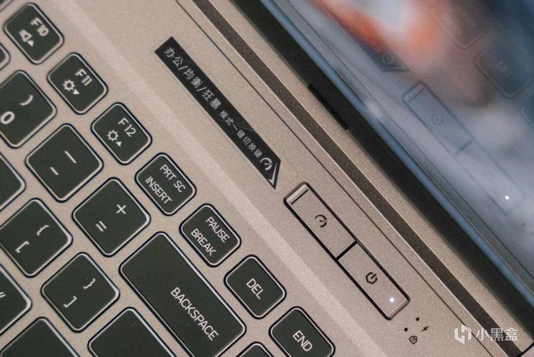 在機身C面,機械革命極光Pro也堅持着這樣的簡約主義,比如前面性能測試中會用到的狂暴模式按鈕就安排在電源鍵旁邊,通過一鍵切換辦公模式、均衡模式和狂暴模式,每一個模式都會有相應的LED背光提示,即使不看屏幕通知,也能便捷知道自己的筆記本處在什麼狀態下。