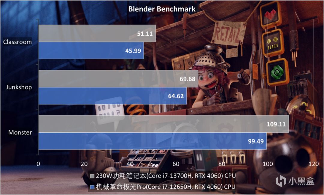同樣在Blender Benchmark場景中,GPU也佔了優勢,CPU部分Core i7-12650H弱於Core i7-13700H情有可原。